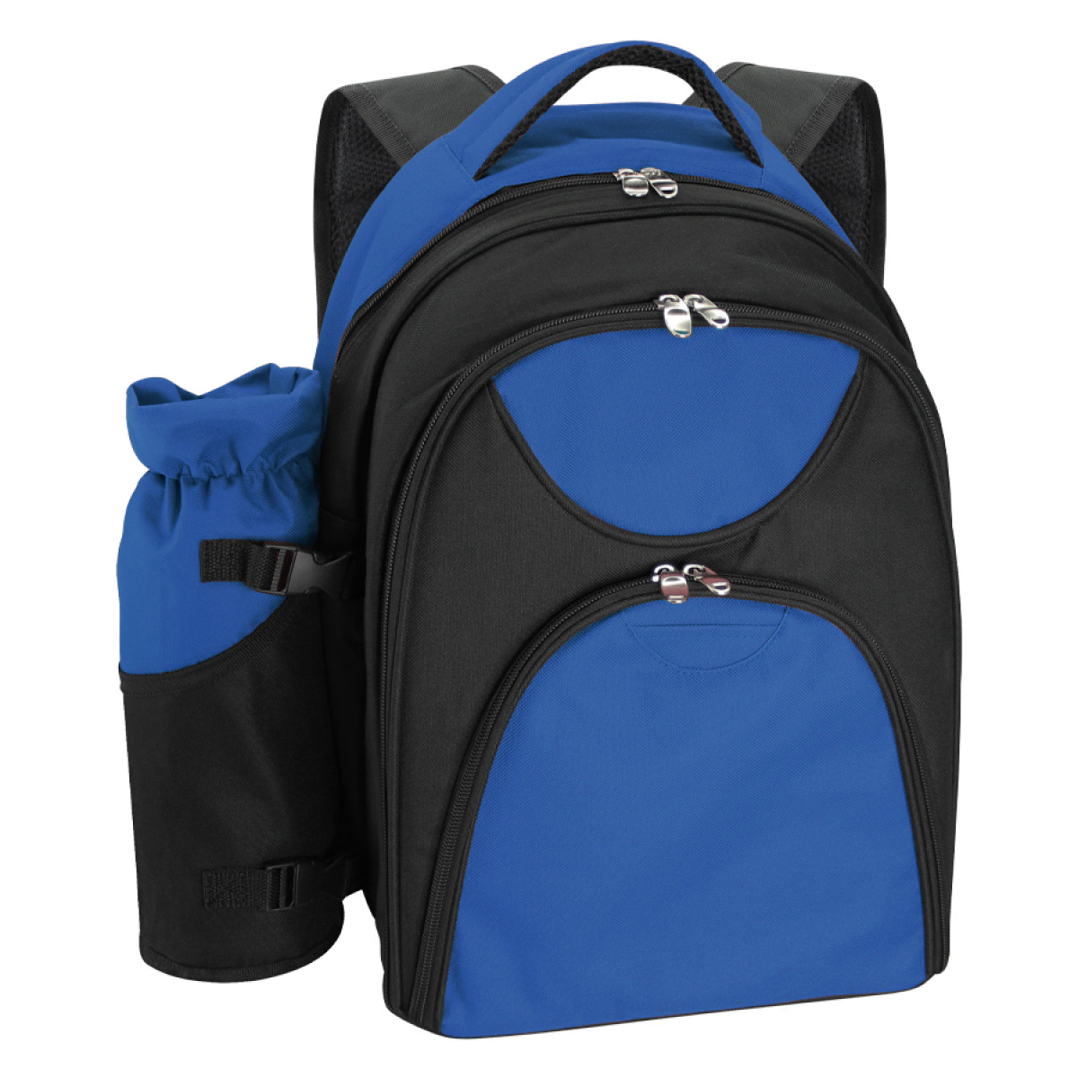 Mochila de Picnic, incluye compartimento con bolso desmontable con accesorios para 4 personas. Compartimento principal y porta-botella desmontable con aislante cooler. Bolsillo delantero independiente para logo.