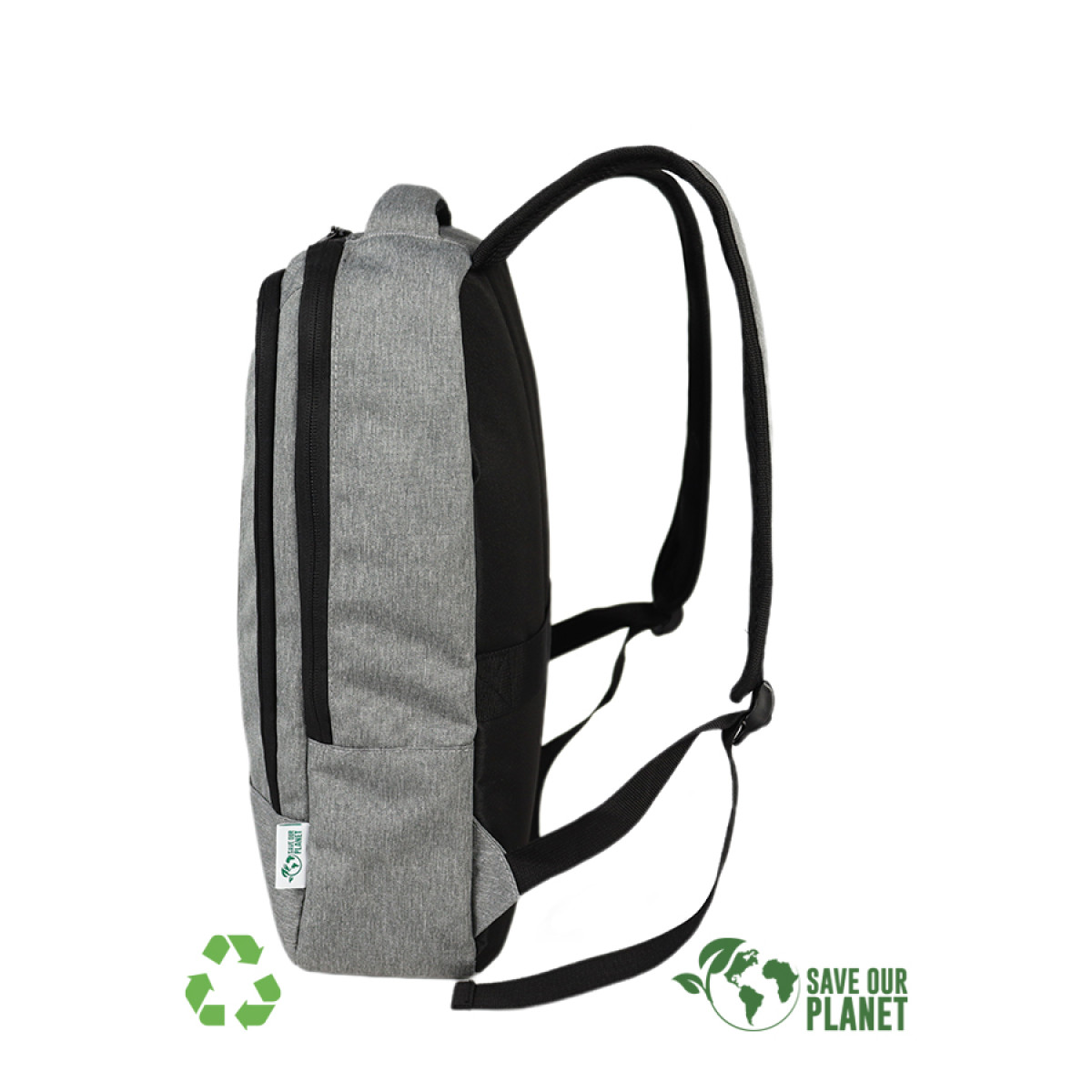 Mochila Porta-Notebook modelo "ECO". Fabricada en material reciclado PONGEE-RPET bitono, eco-cuero 210D/PU y poliéster 300D/PU. Capacidad 12.5 litros, tamaño 30 x 41.5 x 10 cm. Incluye compartimento interior reforzado y acolchado para Laptop y doble bolsillo delantero.