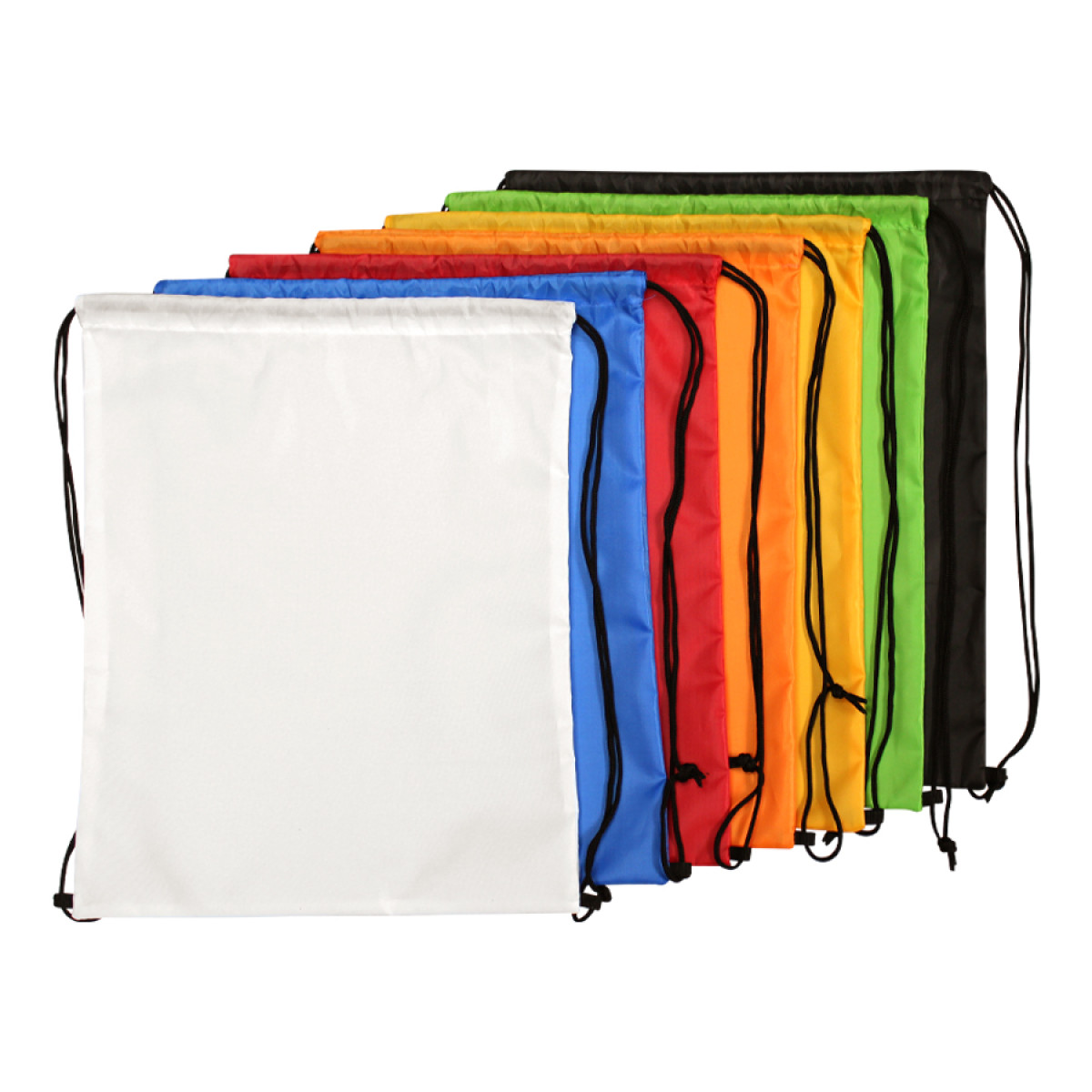 Mochila simple de 210D/PU poliéster, con tiras de cordón negro. Color blanco ideal para imprimir en sublimación.