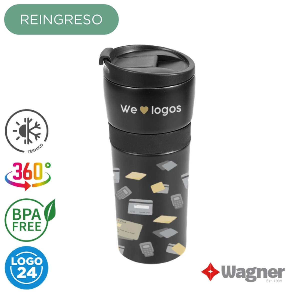 Mug térmico de doble pared en acero inoxidable. Cuenta con terminación exterior en color negro mate. Posee grip de silicona antideslizamiento y Cierre hermético y boca para tomar con traba a presión y silicona para evitar derrames. Interior de acero inoxidable. LOGO24: Producto disponible para el servicio de logueo en 24 horas respetando unidades mínimas de logueo y 200 unidades máximas. Consultar términos y condiciones del servicio. Capacidad: 500 ml. Medida: 20,3 x Diámetro 8,2 cm. Producto libre de BPA. Wagner, Próximos arribos: las fechas, y cantidades de entregas son estimativas y están sujetas a cambios.