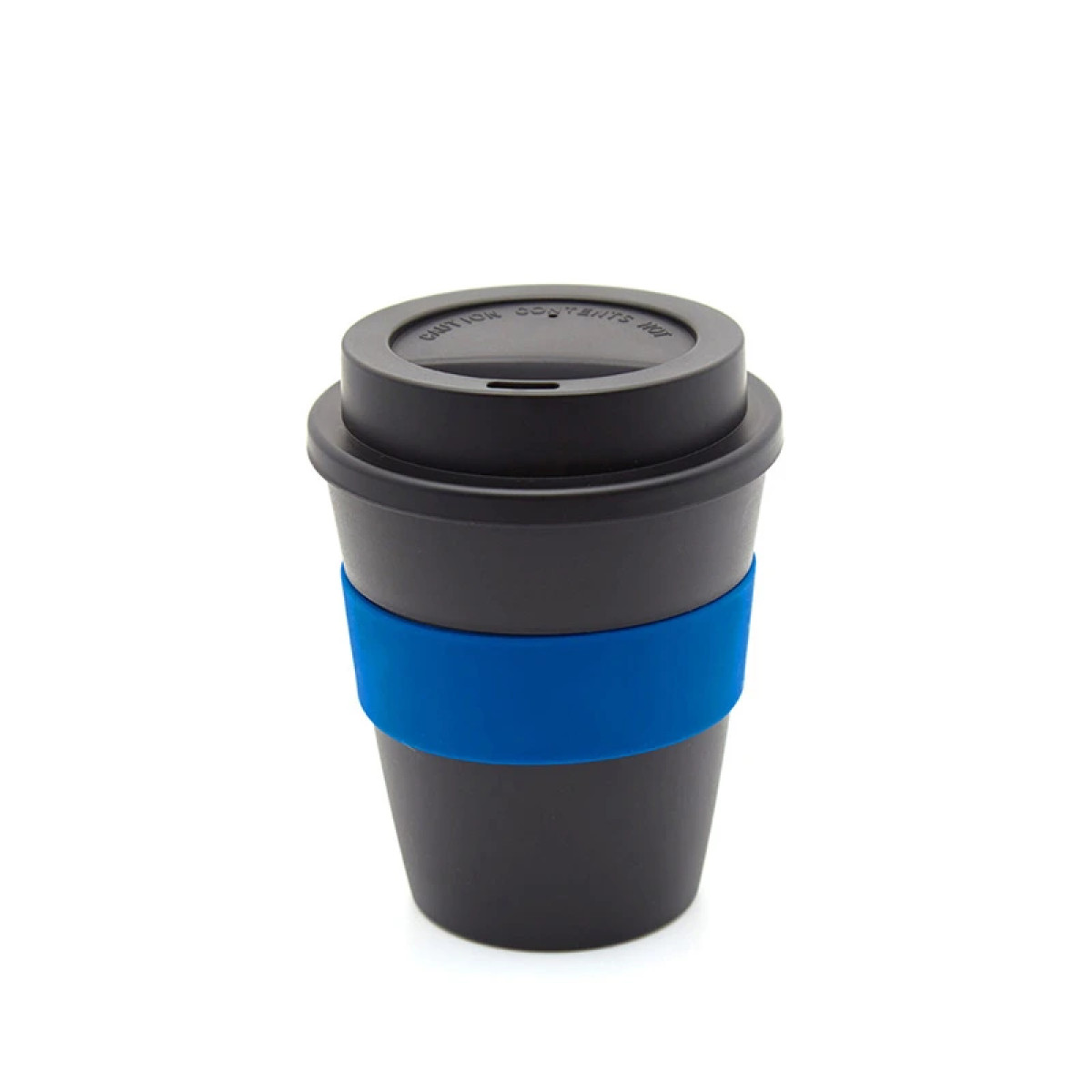 Vaso reutilizable fabricado en polipropileno con banda de silicona personalizable.