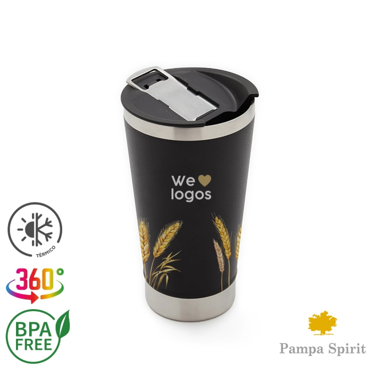Mug de 600 ml fabricado en doble pared de acero inoxidable, diseñado para mantener la temperatura ideal, ya sea fría o caliente. Su tapa de PP incluye un destapador de botellas, combinando estilo y funcionalidad, perfecto para cualquier ocasión. El producto se presenta en una bolsa de PLA 100% compostable dentro de una caja de cartulina Kraft. Producto libre de BPA, aprobado por el I.N.A.L. para el contacto con alimentos. Pampa Spirit