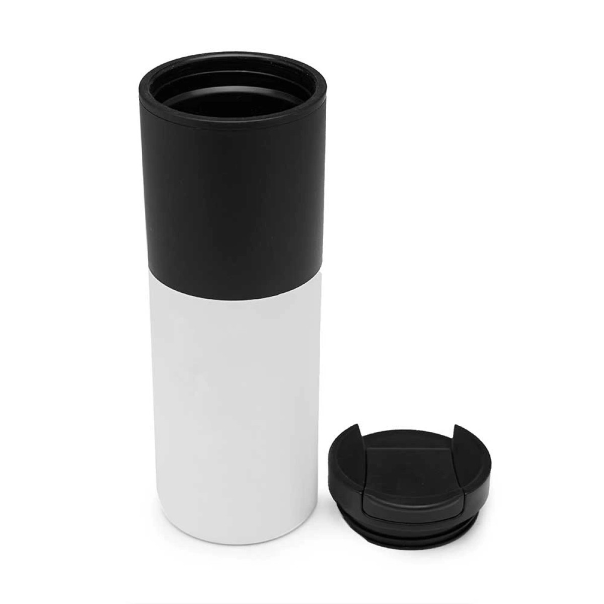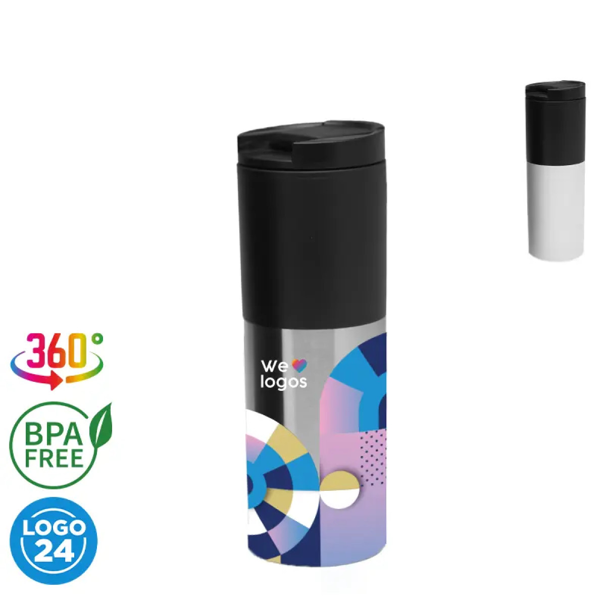 Mug térmico realizado con aluminio e interior de polipropileno negro. Boquilla regulable. Doble pared plástica. Packaging: Caja Impresa. Medidas: 22 cm x Diámetro 7,5 cm. Interior realizado en plástico. Capacidad: 450 ml. Producto libre de BPA. LOGO24: Producto disponible para el servicio de logueo en 24 horas respetando unidades mínimas de logueo y 200 unidades máximas. Consultar términos y condiciones del servicio