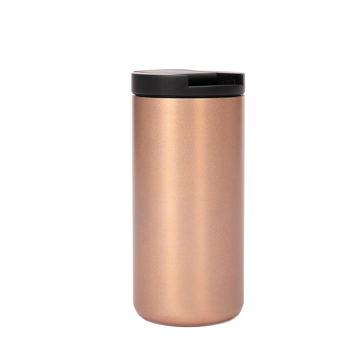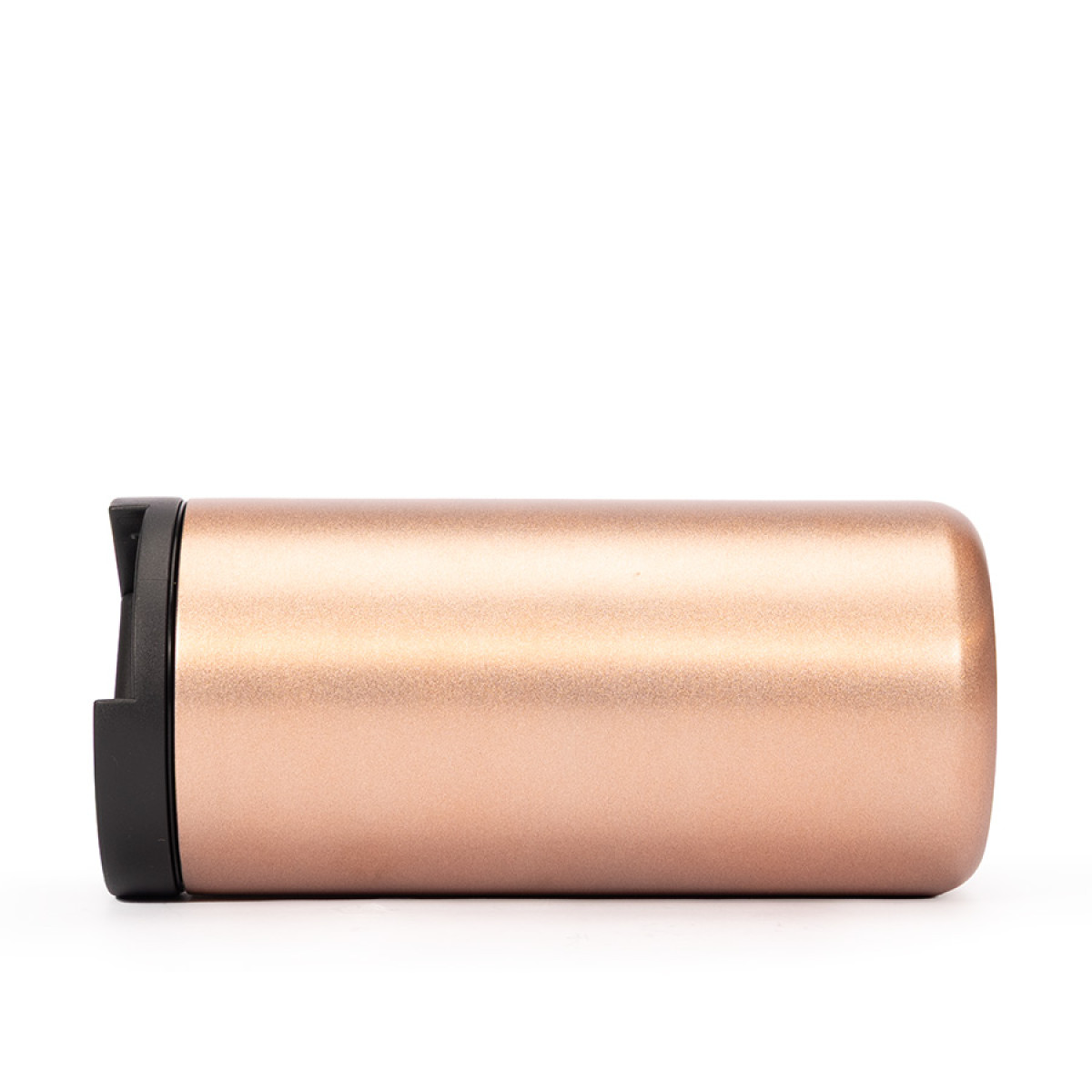 Mug metálico cilíndrico con doble pared aislante, interior Acero inoxidable 304 SS, exterior Acero inoxidable 201 SS, recubierto con pintura POWDER COAT color cobre. Producto BPA FREE, para el contacto con líquidos y alimentos. Fondo de silicona negra ABS anti-deslizante. Con tapa pull-up de plástico ABS negro y dosificador con sello cilíndrico de silicona. Capacidad 500ml. Presentación en bolsa compostable blanca + caja de regalo de cartón negro.
