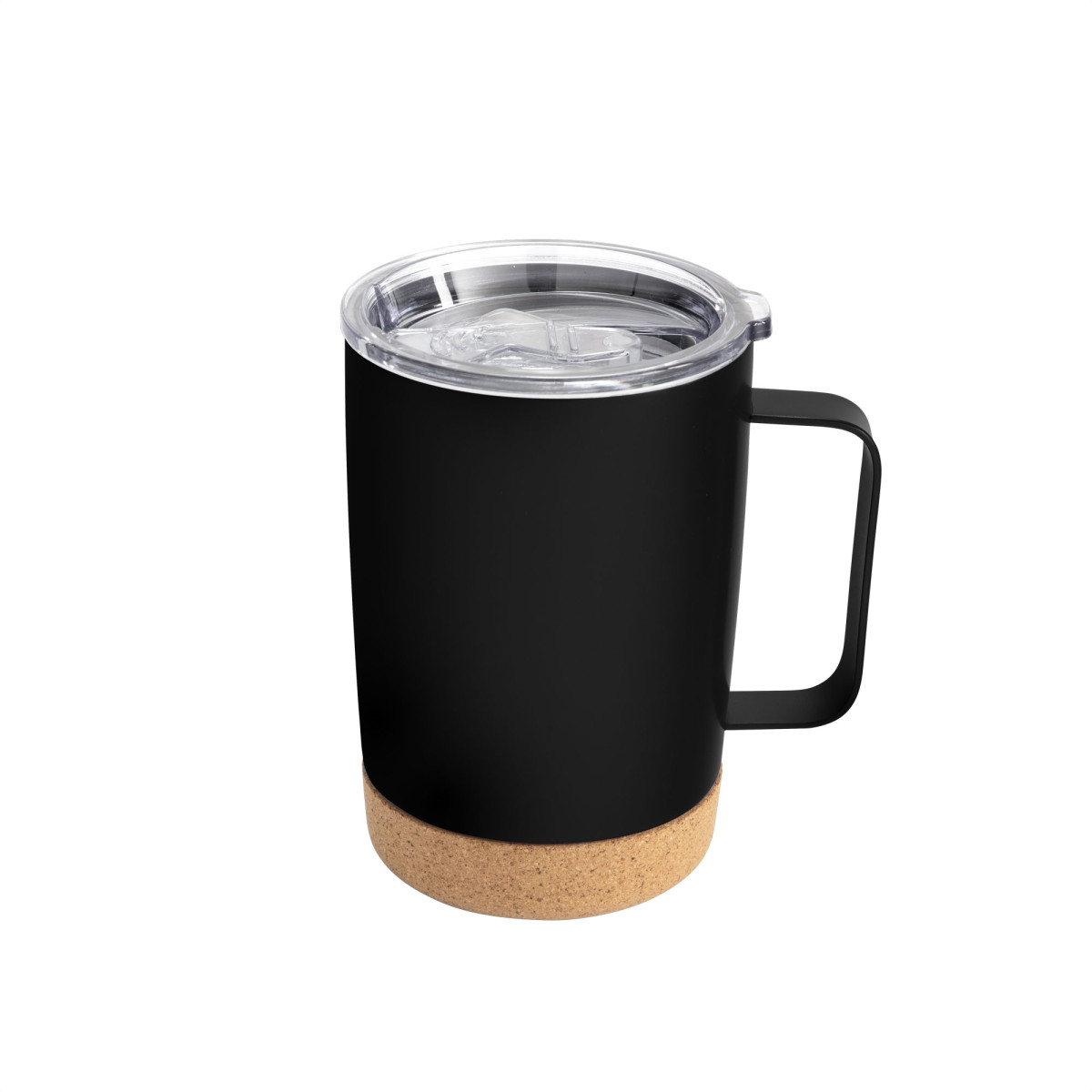 Diseño elegante con base de corcho.Mug doble pared con asa, sellado al vacío. Mug con aislamiento térmico. Tecnología vacuum. Interior en acero 304 y exterior en acero 201. Tapa de poliestireno con anillo de silicona. Asa metálica. Base de corcho. Pintura acabado semi mate. Mantiene hasta 12 hs la temperatura de las bebidas calientes y 24 hs de las bebidas frías.Medidas: Ø 8,5 cm x 13 cm. (no incluye asa)