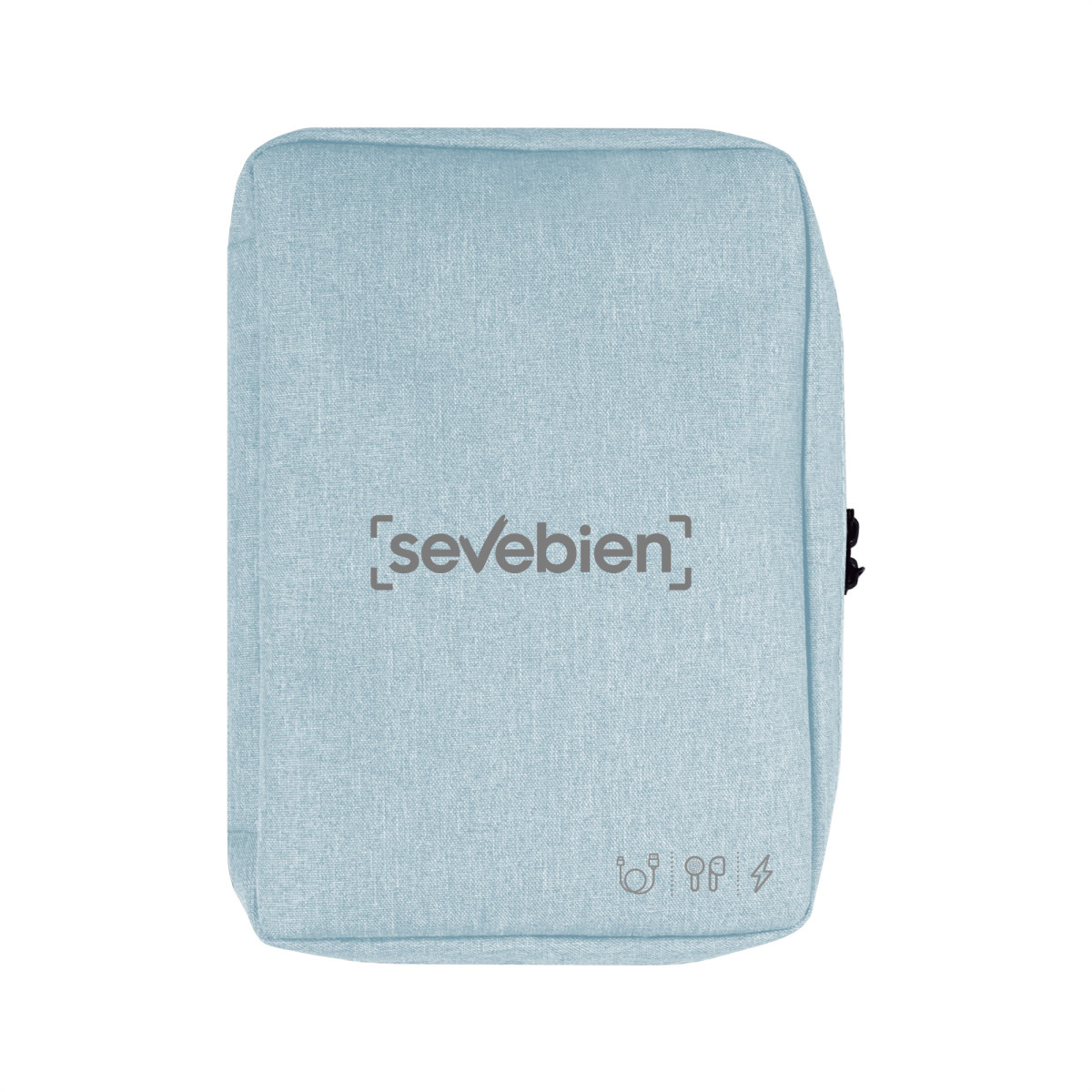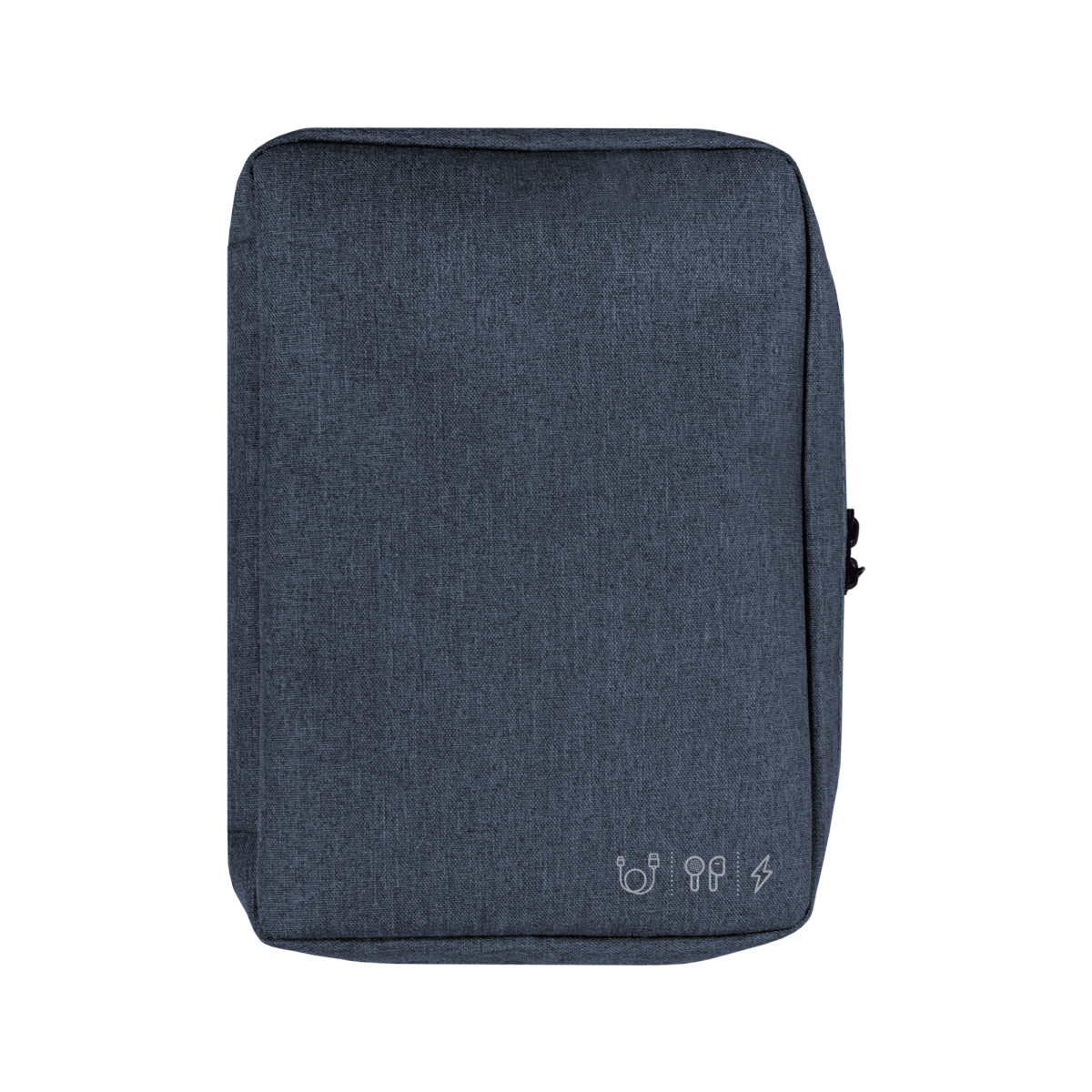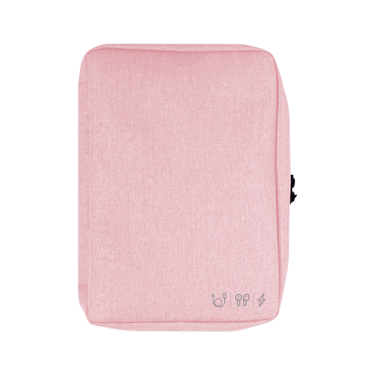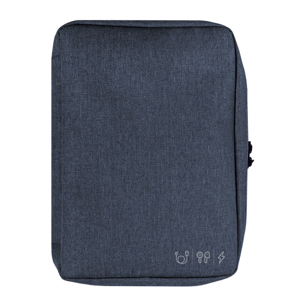 19 x 26 x 5 cm. Poliéster. Organizador para cables y accesorios. Cuenta con dos bolsillos de red con cierre. 4 elásticos que permiten arrollar y guardar los cables, 1 elástico porta bolígrafo y 2 elásticos amplios. NO INCLUYE ACCESORIOS.