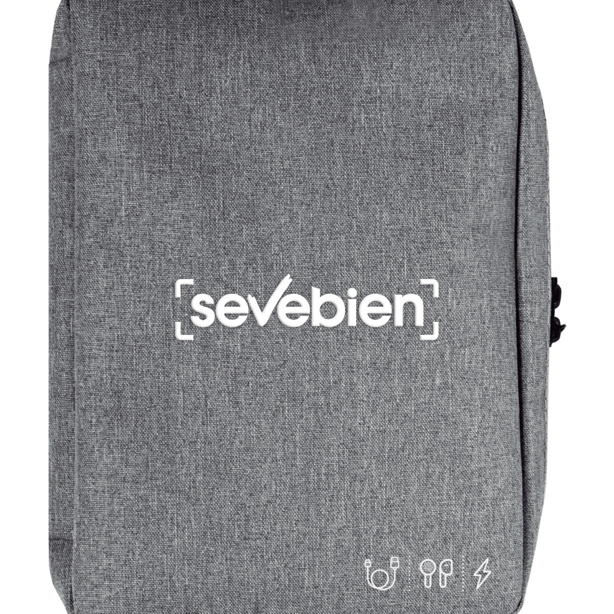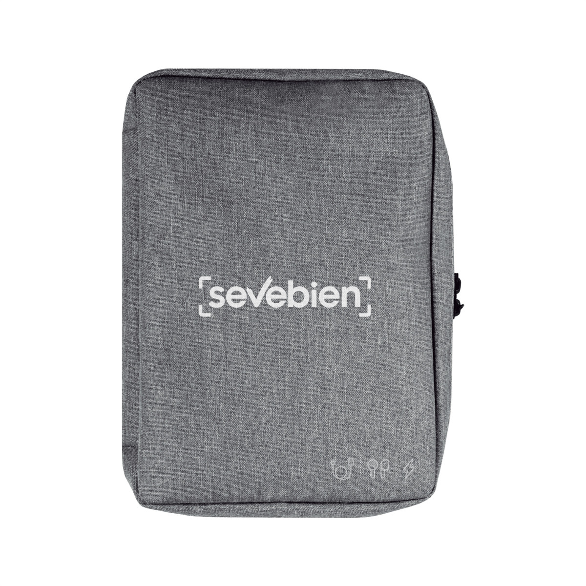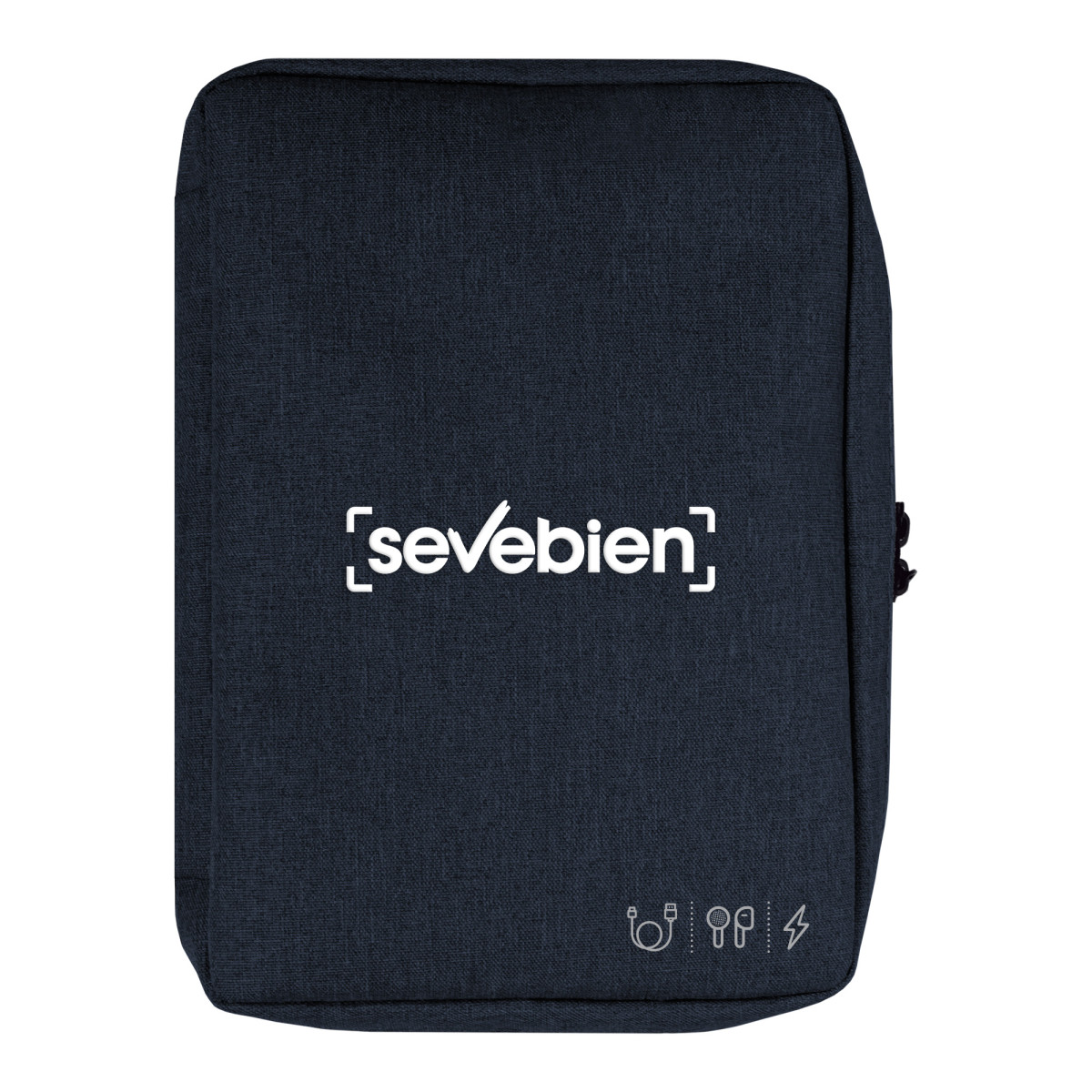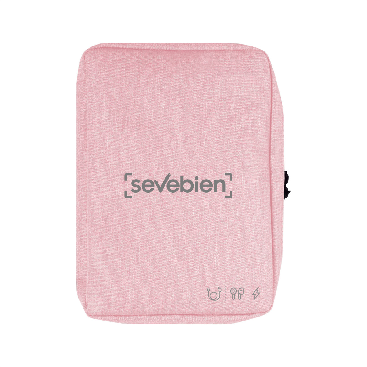 19 x 26 x 5 cm. Poliéster. Organizador para cables y accesorios. Cuenta con dos bolsillos de red con cierre. 4 elásticos que permiten arrollar y guardar los cables, 1 elástico porta bolígrafo y 2 elásticos amplios. NO INCLUYE ACCESORIOS.