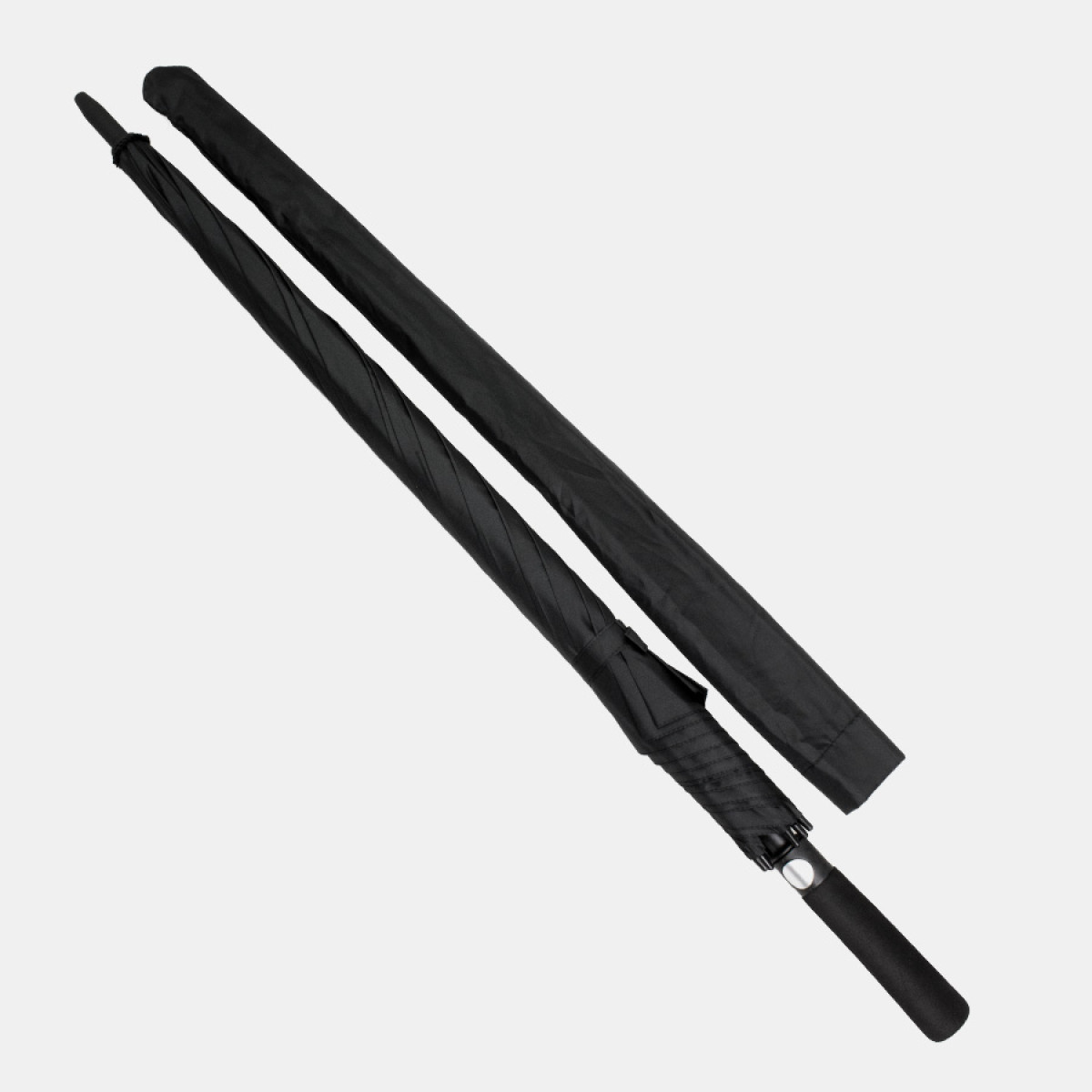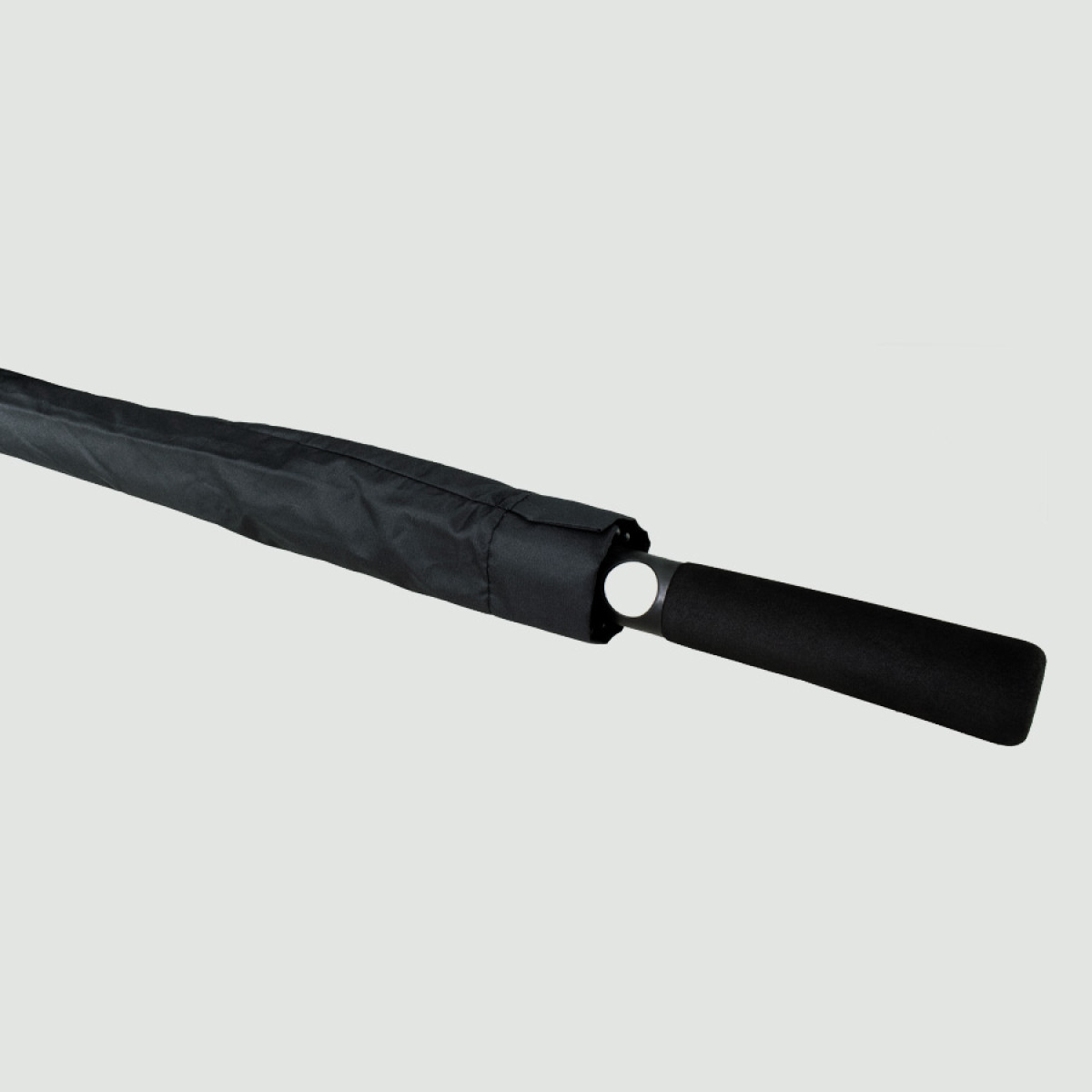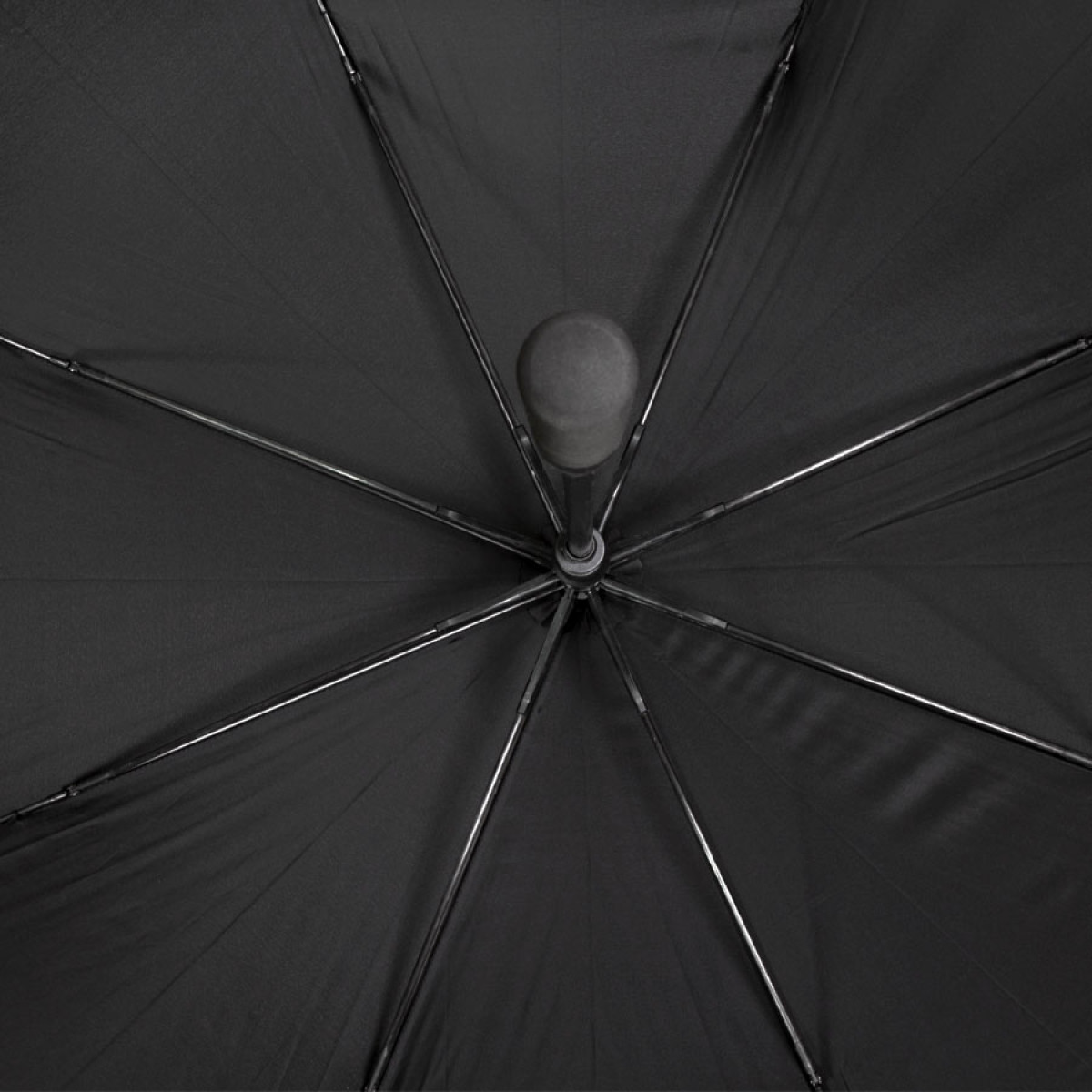 Paraguas ejecutivo grande, con 8 cascos de tela 190T PONGEE, reverso UV. Contiene varas reforzadas Anti-Vuelco de Fibra de Vidrio color negro y sistema de apertura automático. Mango recto de EVA negro. Incluye funda al tono de 190T PONGEE.