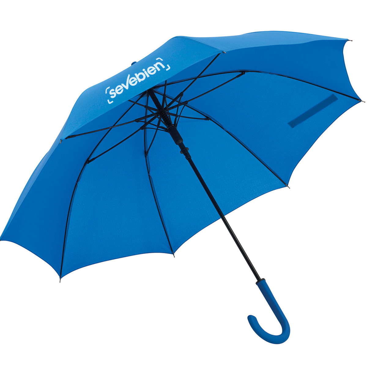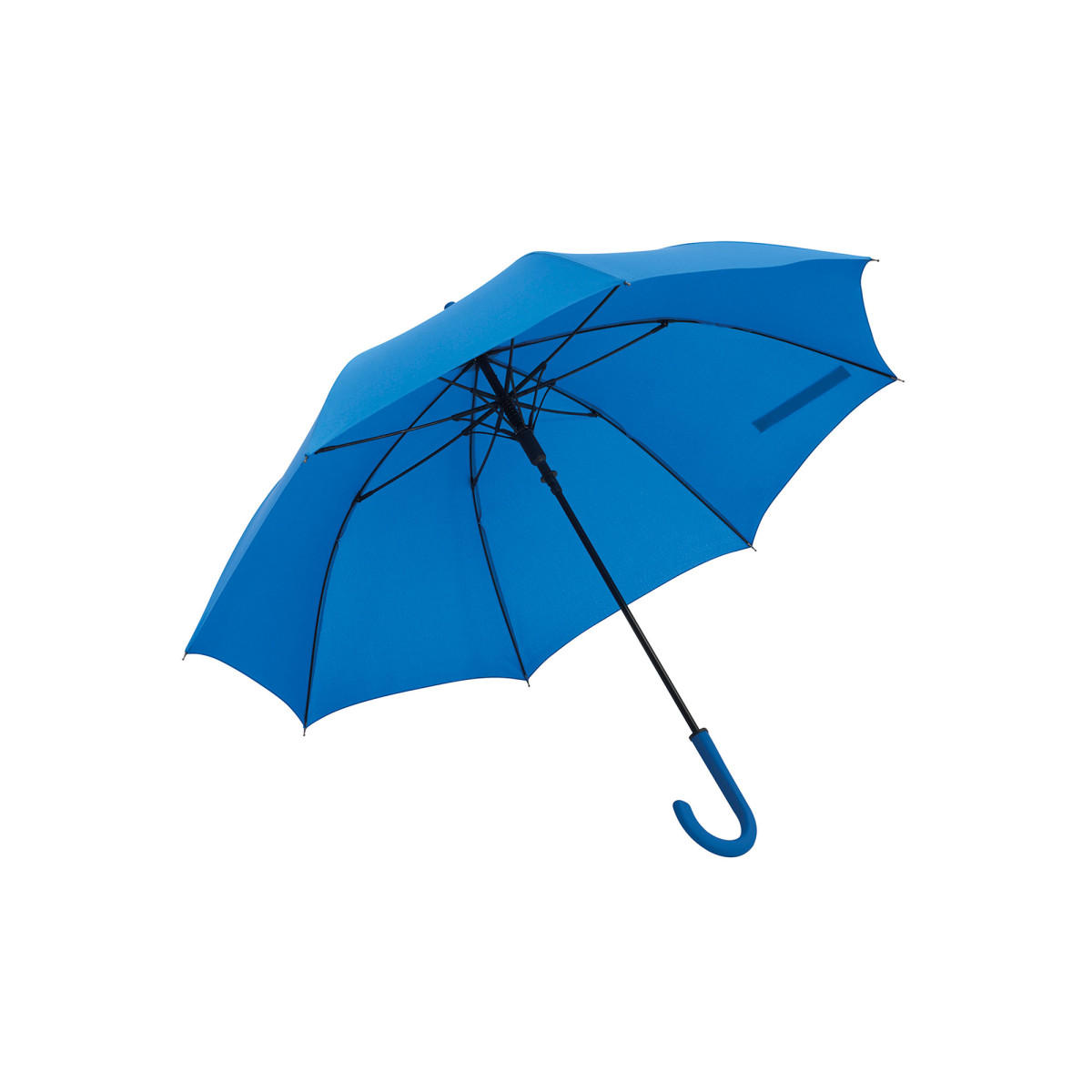 Ø103 cm. Aprox. Bastón metálico, varillas en fibra de vidrio, puntas metálicas y mango curvo de plástico. APERTURA AUTOMÁTICA. Con cierre de velcro.