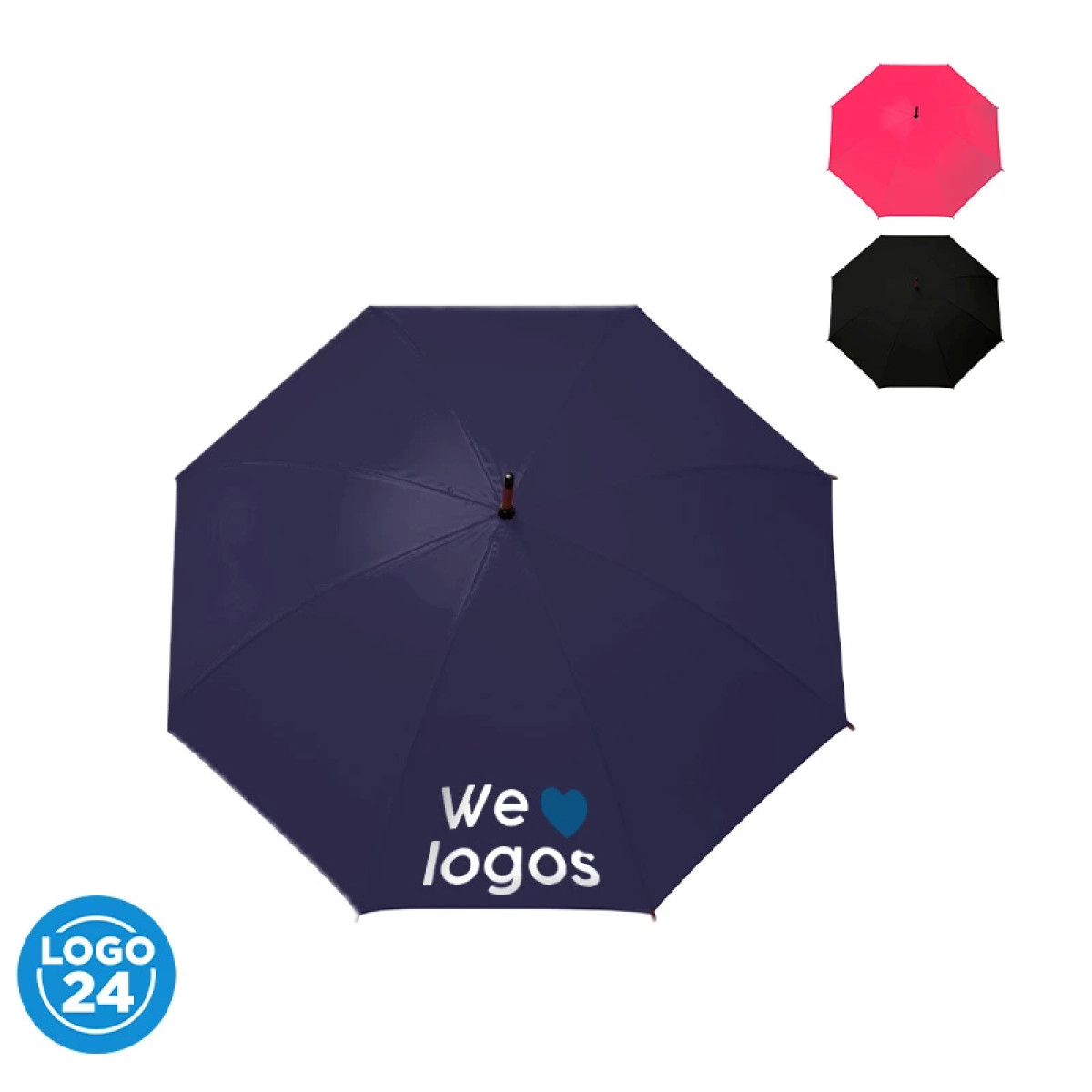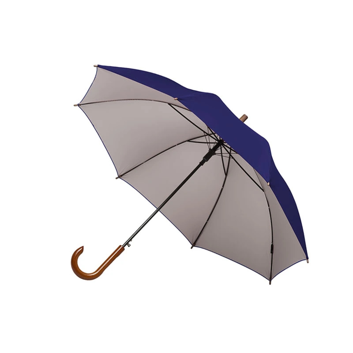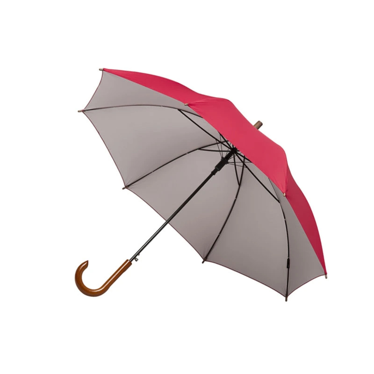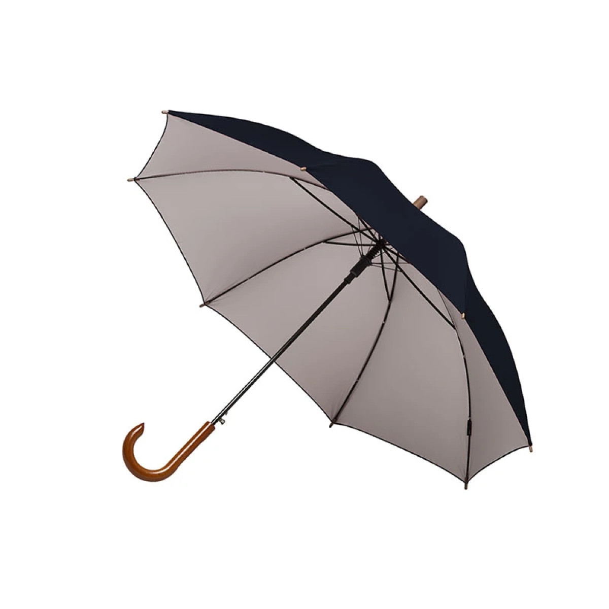 Paraguas street de 8 gajos con mango curvo de madera y estructura metálica negra. Con sistema de apertura automática. Tela de interior silver combinada con exterior en colores. Material: Pongee con interior silver. Medidas: 80 cm x Diámetro 105 cm. LOGO24: Producto disponible para el servicio de logueo en 24 horas respetando unidades mínimas de logueo y 200 unidades máximas. Consultar términos y condiciones del servicio