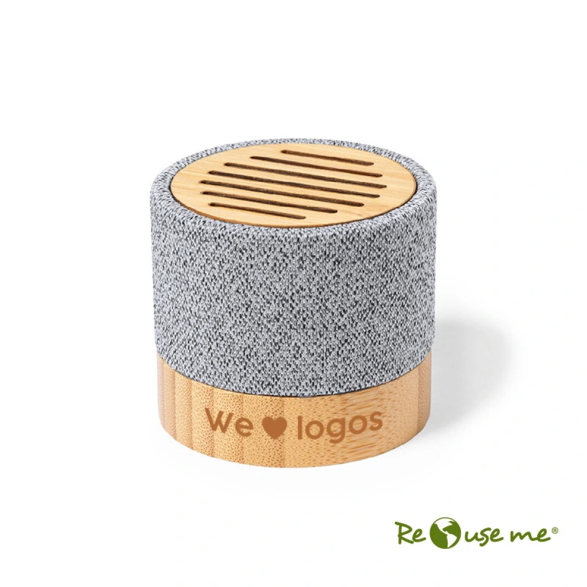 Parlante portátil fabricado en bambú y RPET. Tiene tecnología Bluetooth 5.0 y una batería de 300 mAh. Ofrece de 2 a 4 horas de reproducción con una carga de 2.5 horas. El parlante viene dentro de una caja de cartón junto a su manual de instrucciones y cable cargador. Dimensiones: 5,4 x 6,05 cm. Reuseme. Incluye Gift Box confeccionada en cartulina Kraft.