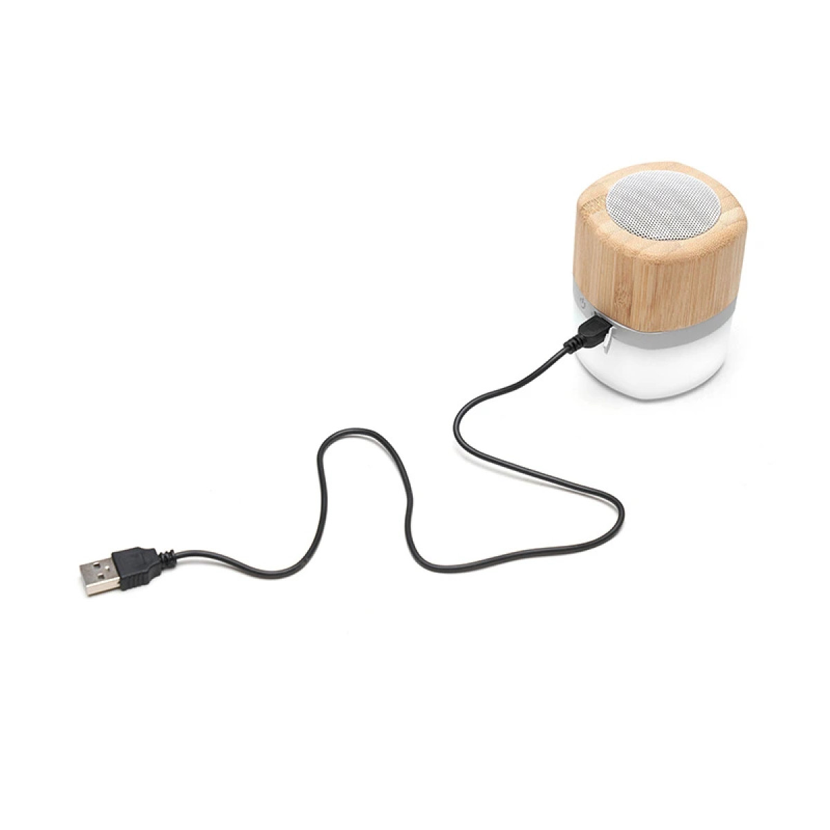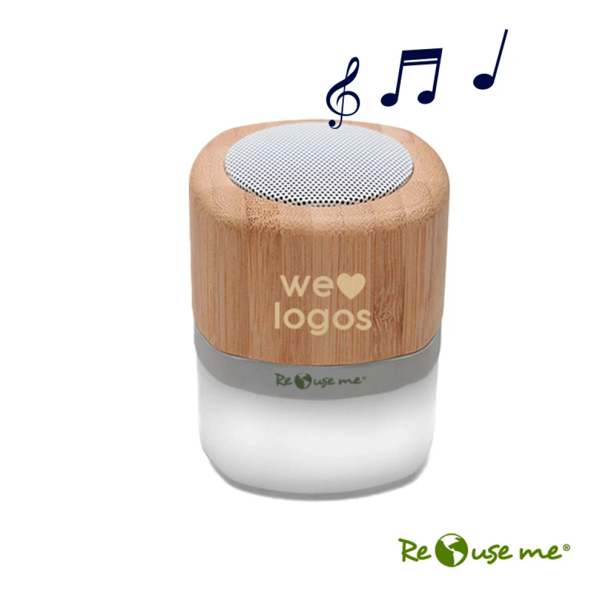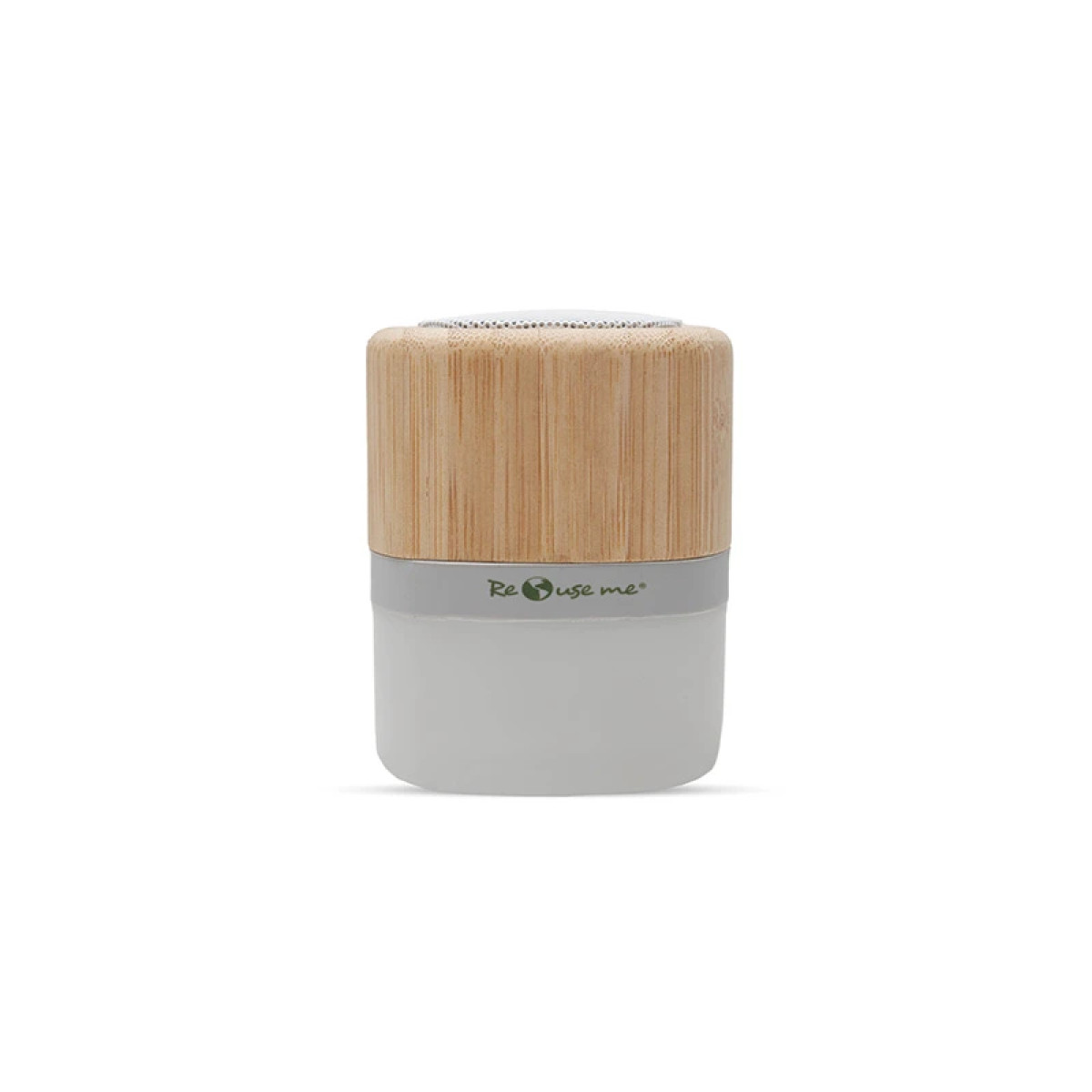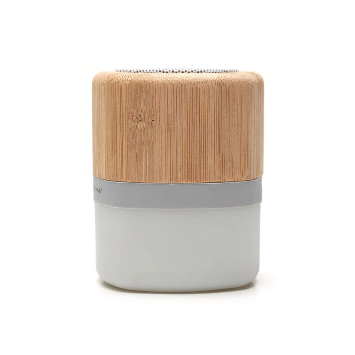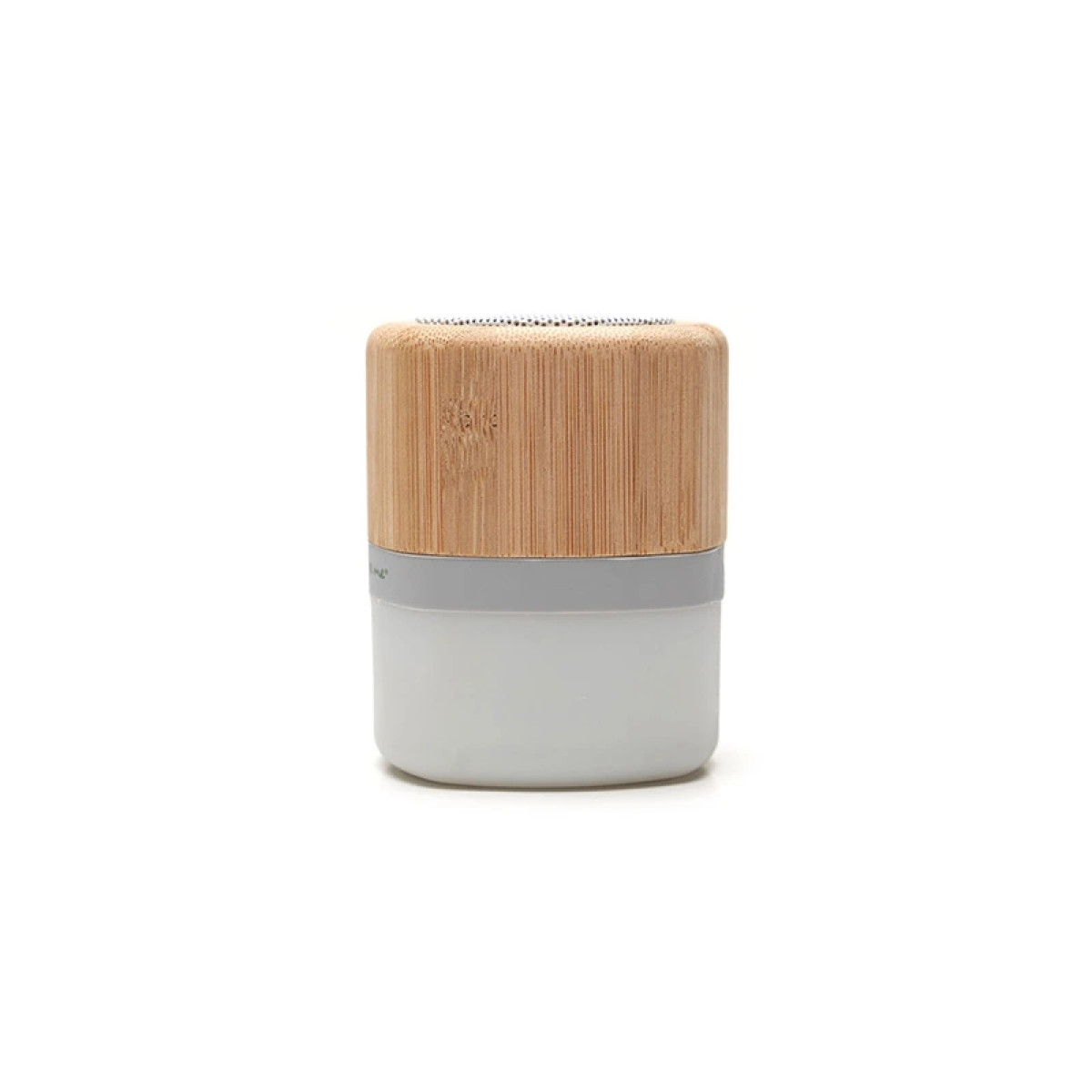 Parlante portátil con tecnología Bluetooth. Realizado en combinación de ABS con Silicona y bamboo, con iluminación en la base. Características técnicas: Batería de 300mAh | Poder del parlante: 3W | Frecuencia: 200Hz-20KHz | Conexión: 5V / 500mA | Distancia de alcance: 10 Metros | Peso 150gr | Medidas: 6 x 6 x 7,5 cm. ReUseMe. Incluye Gift Box confeccionada en cartulina Kraft.