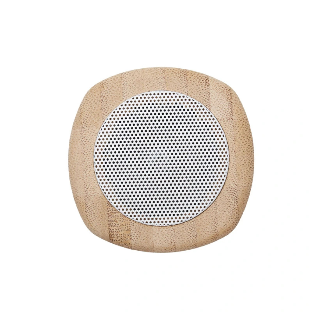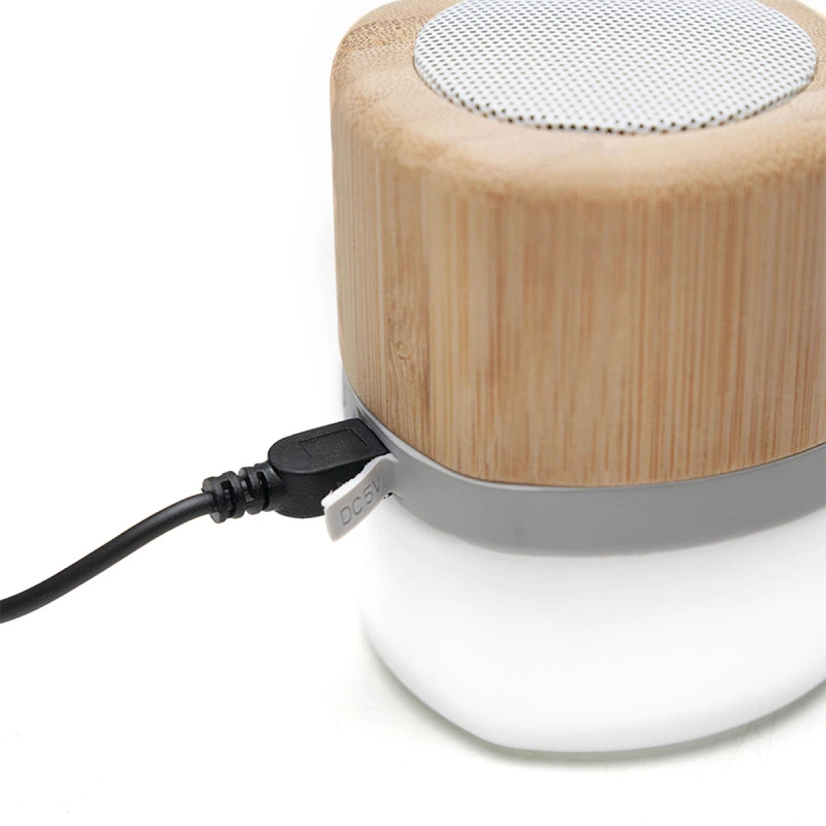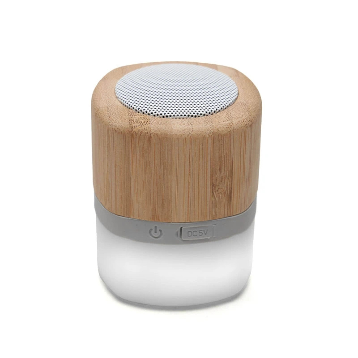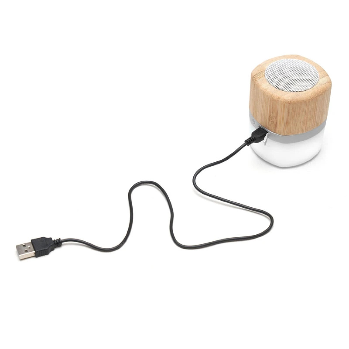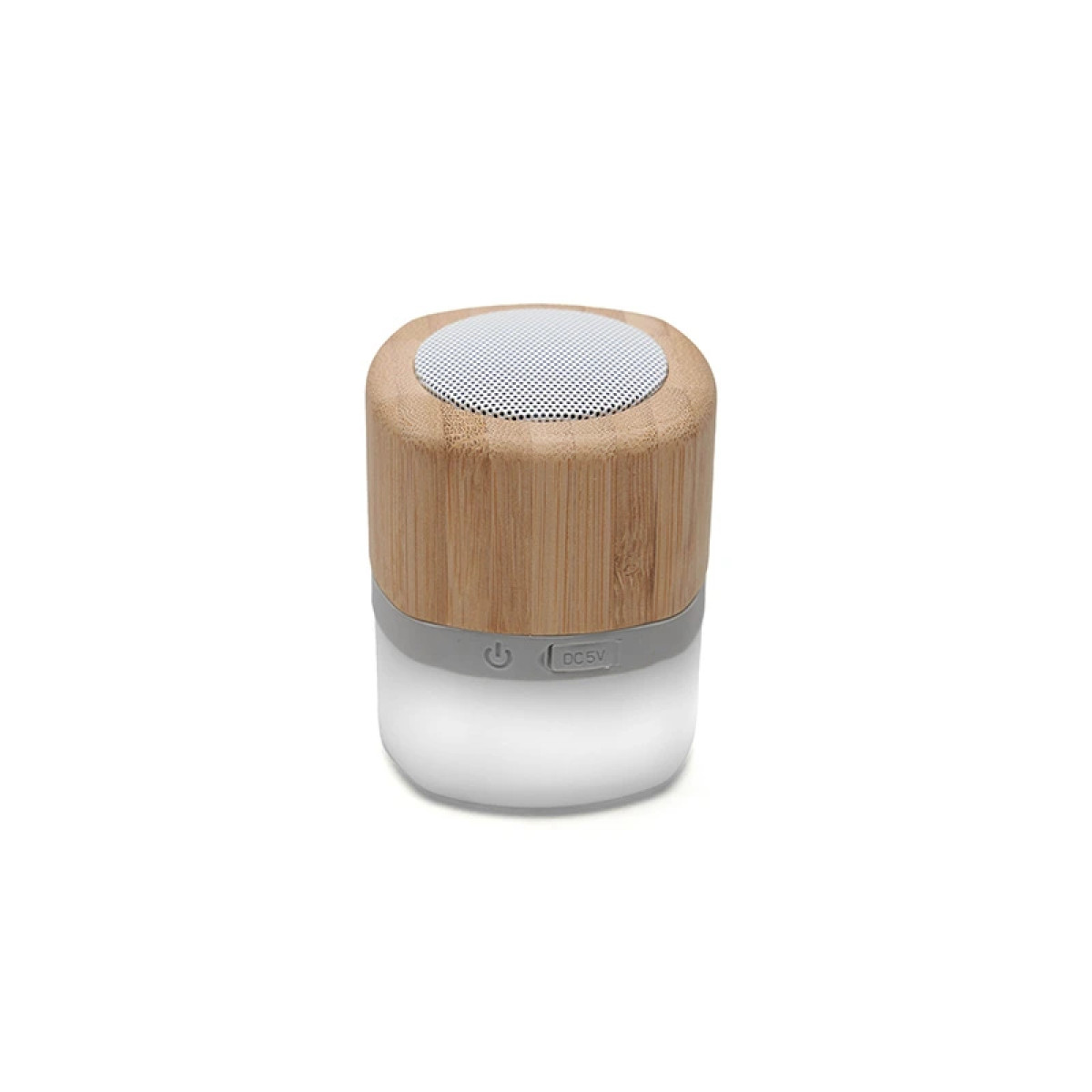 Parlante portátil con tecnología Bluetooth. Realizado en combinación de ABS con Silicona y bamboo, con iluminación en la base. Características técnicas: Batería de 300mAh | Poder del parlante: 3W | Frecuencia: 200Hz-20KHz | Conexión: 5V / 500mA | Distancia de alcance: 10 Metros | Peso 150gr | Medidas: 6 x 6 x 7,5 cm. ReUseMe. Incluye Gift Box confeccionada en cartulina Kraft.