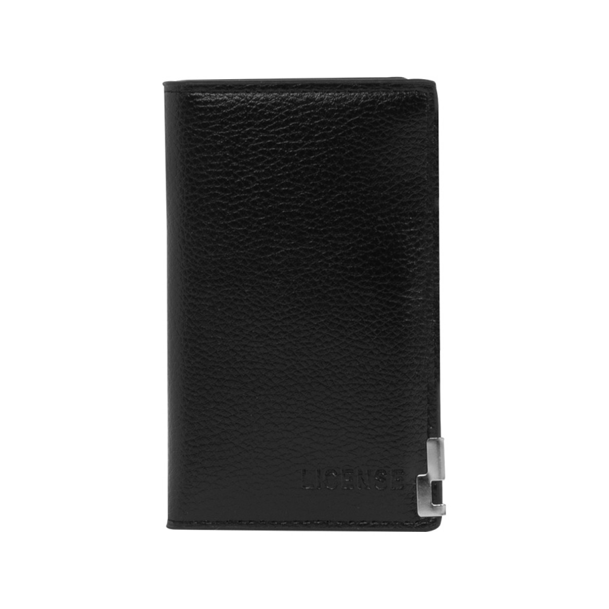 Billetera portas-tarjetas de eco-cuero negro, formato vertical, modelo "LICENSE". Contiene 8 compartimentos interiores. Presentación en bolsa frozen y caja de cartón forrado negro opaco.