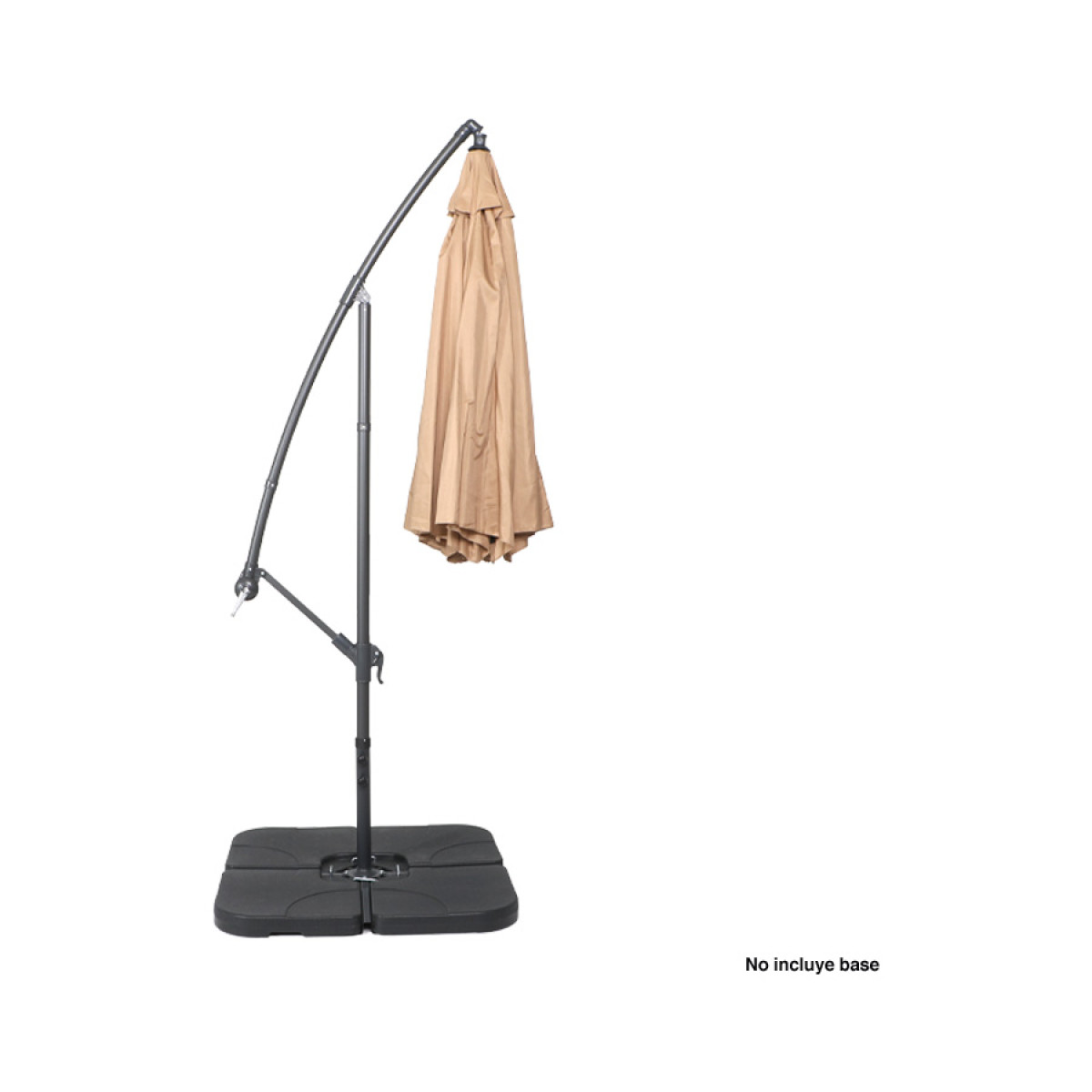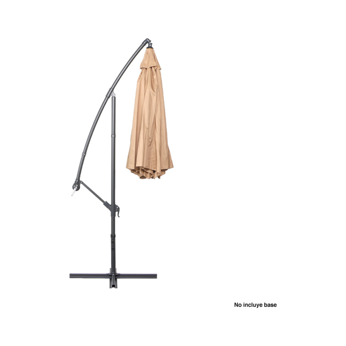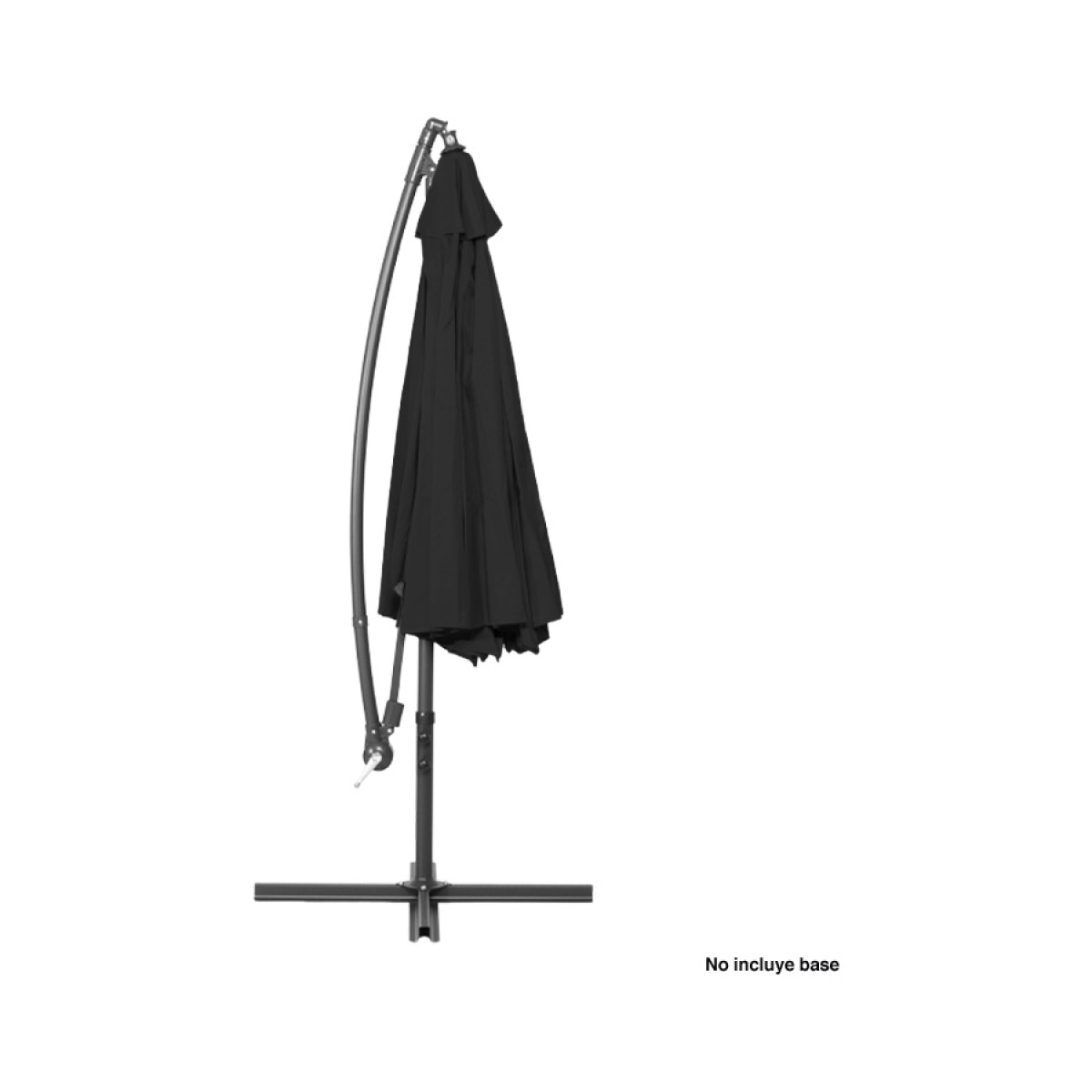 Quitasol colgante redondo de Ø3m, modelo "Banana", con 8 cascos de lona Poliéster UV impermeable de 160g. Contiene varas reforzadas de Acero recubierto de 12 x 18mm, asta de Acero recubierto de 48mm, sistema de apertura manual.