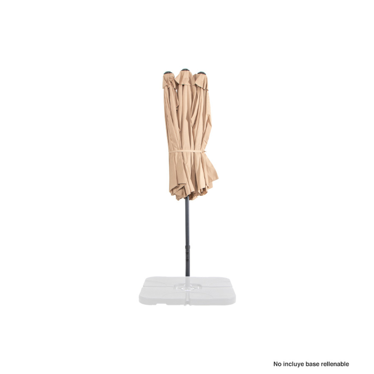 Quitasol ovalado doble de 4.55 x 2.7 m, modelo "Twins", con 12 cascos de lona Poliéster UV impermeable de 180g. Contiene varas reforzadas de Acero recubierto de 12 x 18mm, asta de Acero recubierto de 48mm, sistema de apertura automático con manivela.