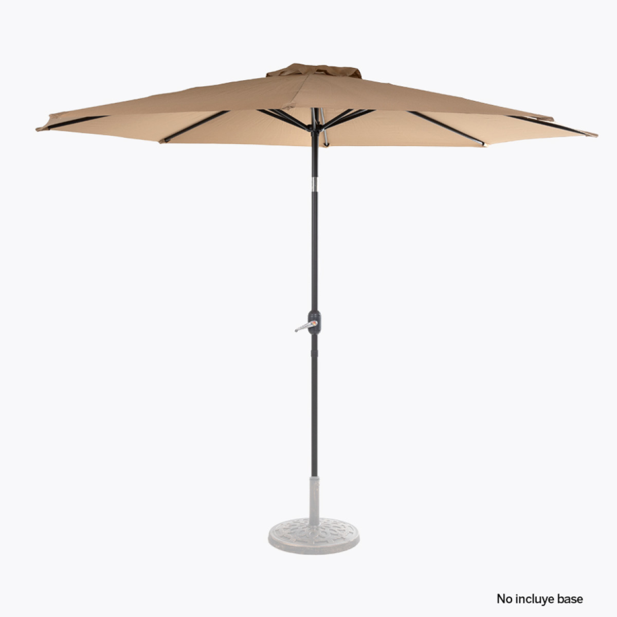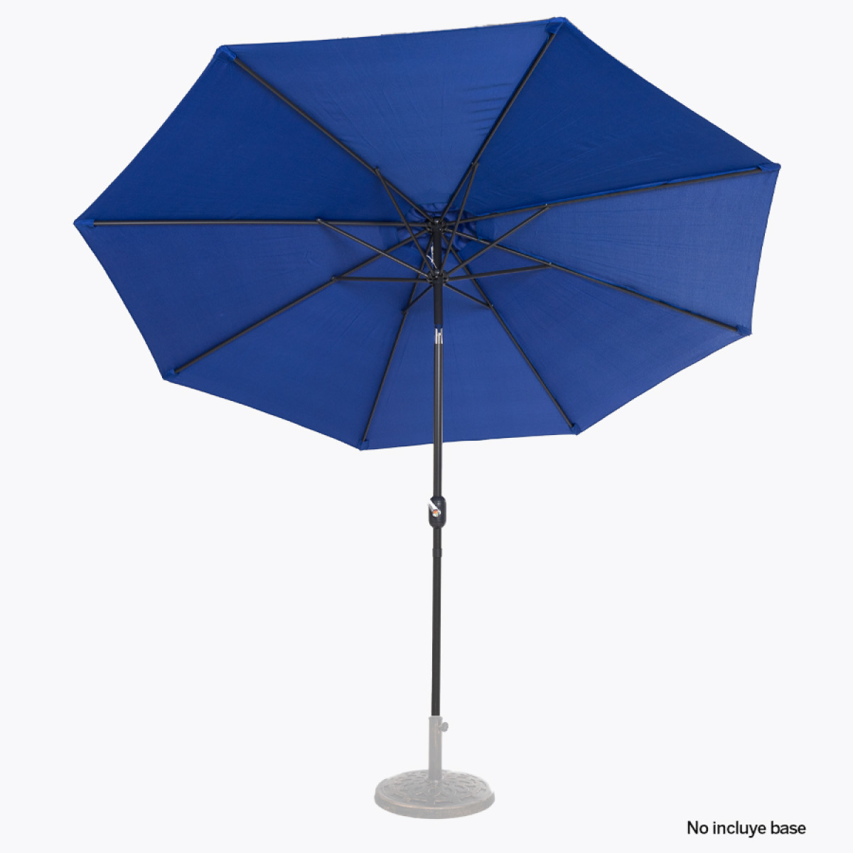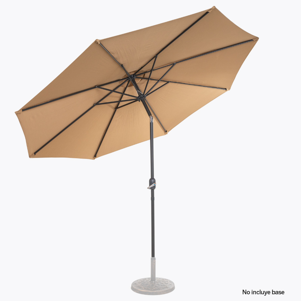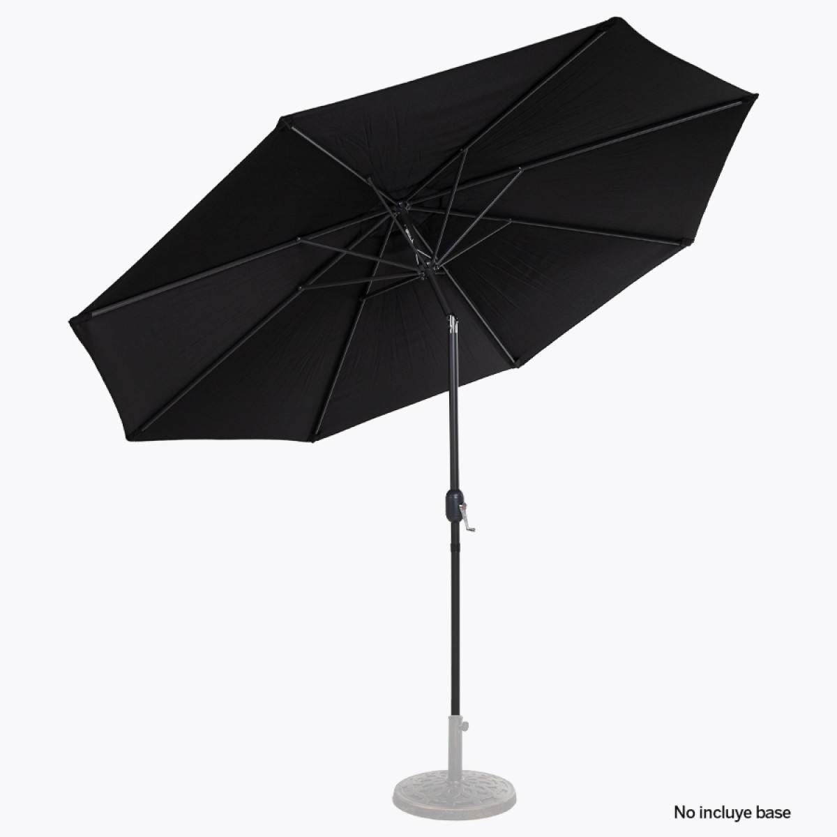 Quitasol redondo de Ø3m, modelo "Shake", con 8 cascos de lona Poliéster UV impermeable de 160g. Contiene varas reforzadas de Acero recubierto de 12 x 18mm, asta de Acero recubierto de 38mm, sistema de apertura automático con manivela y codo giratorio de 45°. No incluye base.
