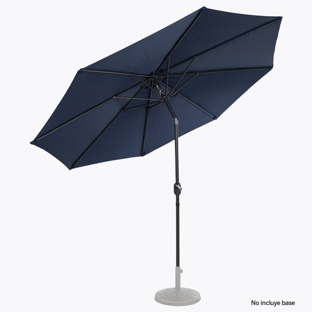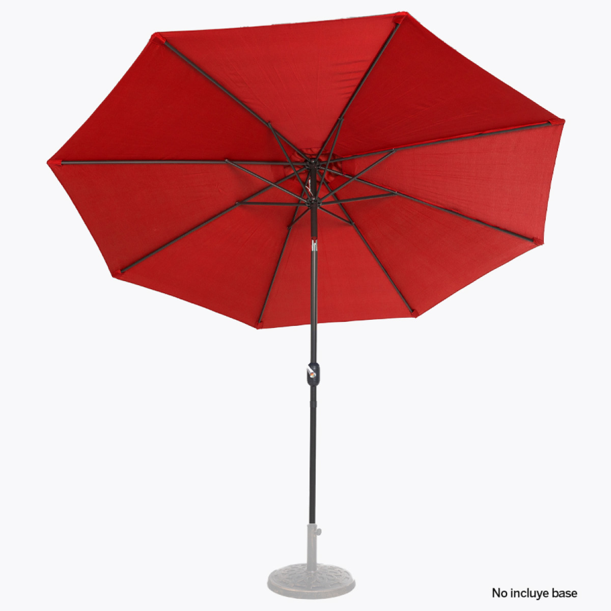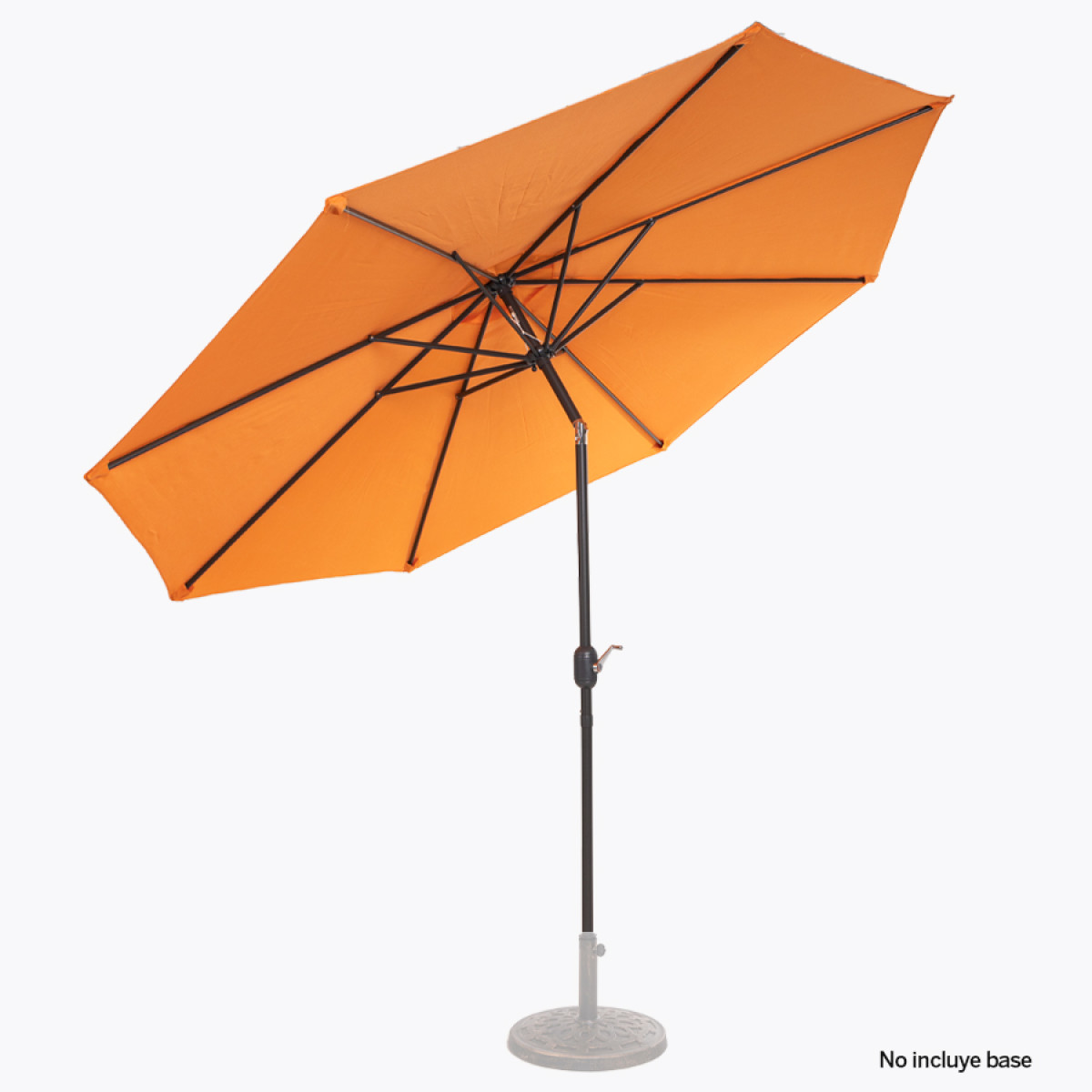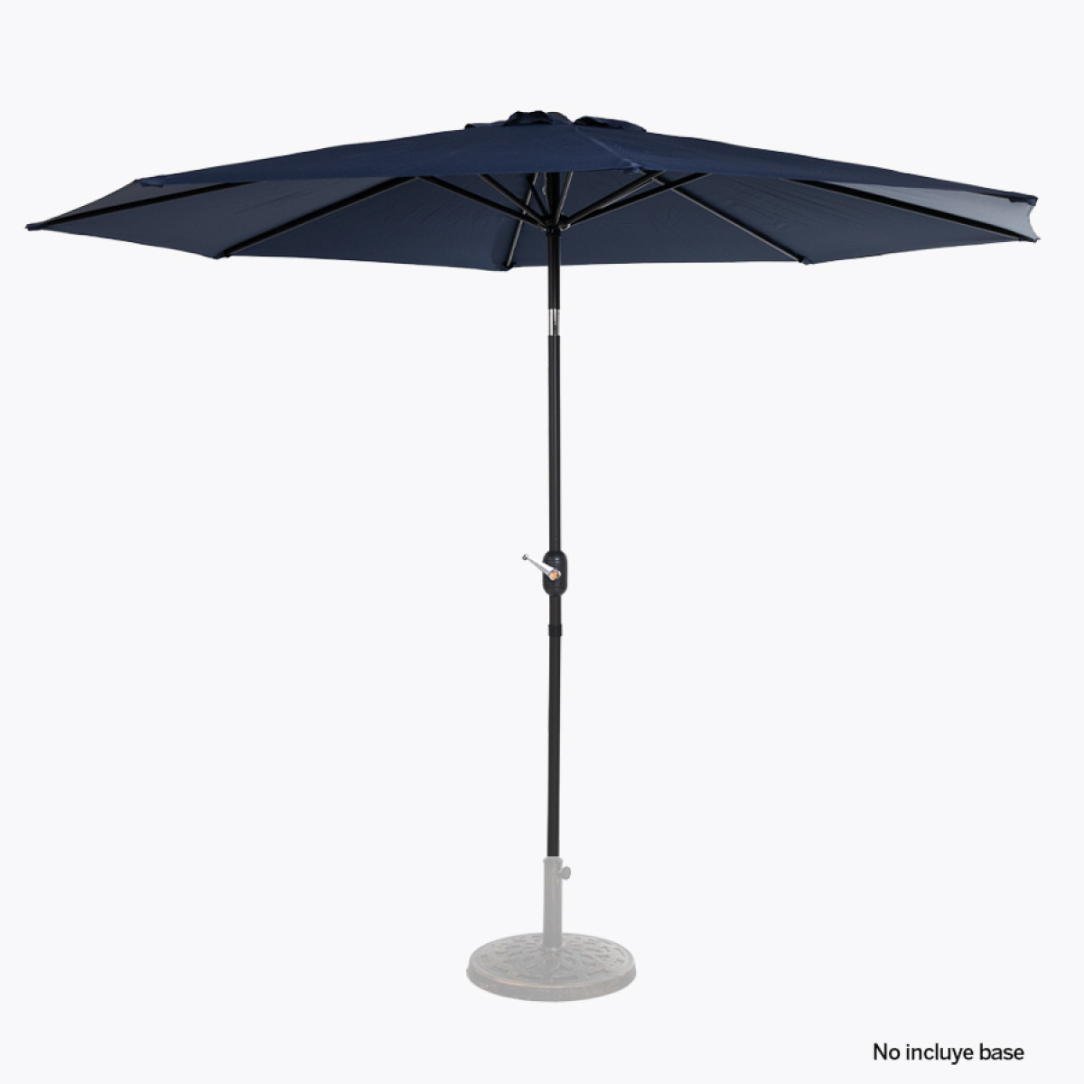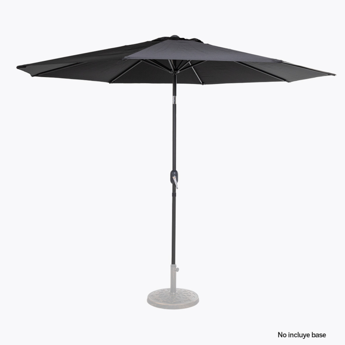 Quitasol redondo de Ø3m, modelo "Shake", con 8 cascos de lona Poliéster UV impermeable de 160g. Contiene varas reforzadas de Acero recubierto de 12 x 18mm, asta de Acero recubierto de 38mm, sistema de apertura automático con manivela y codo giratorio de 45°. No incluye base.