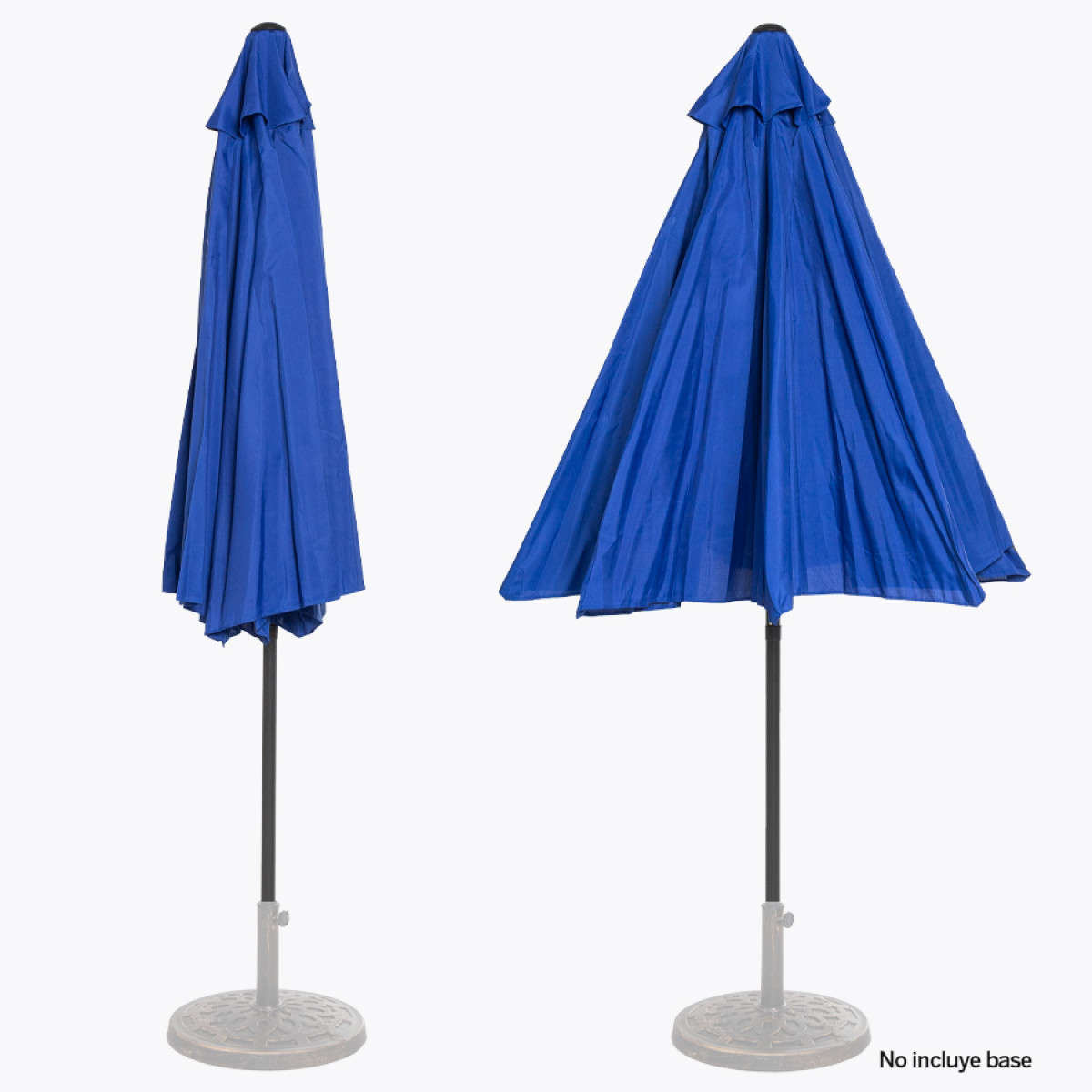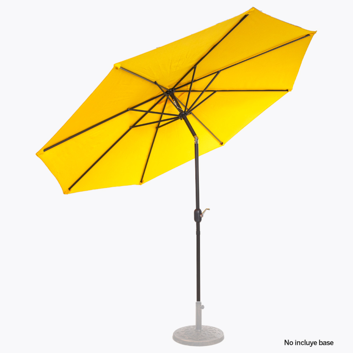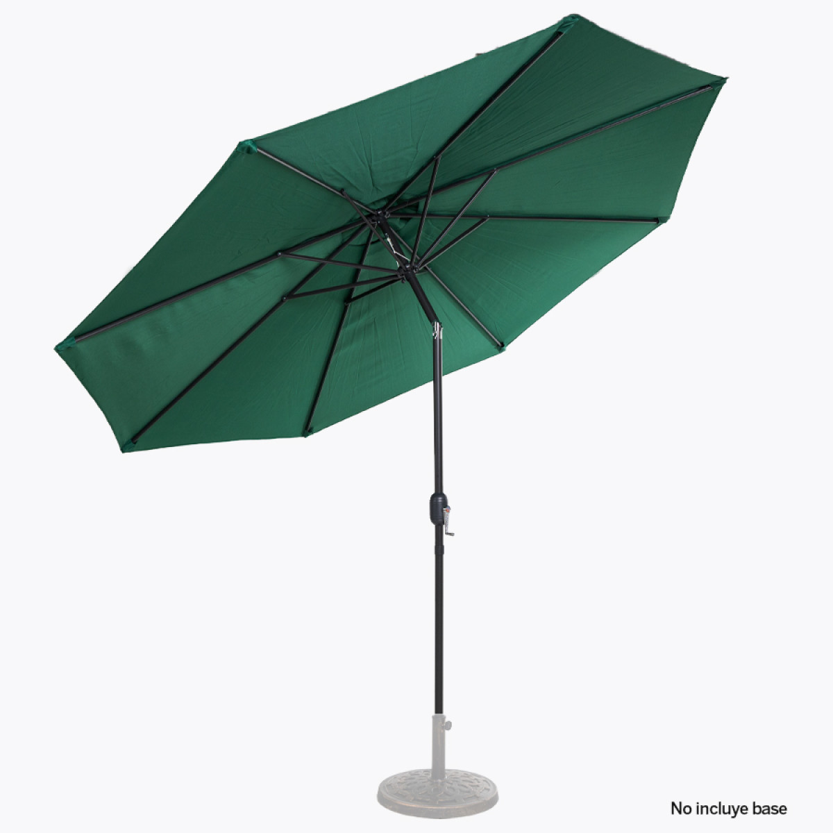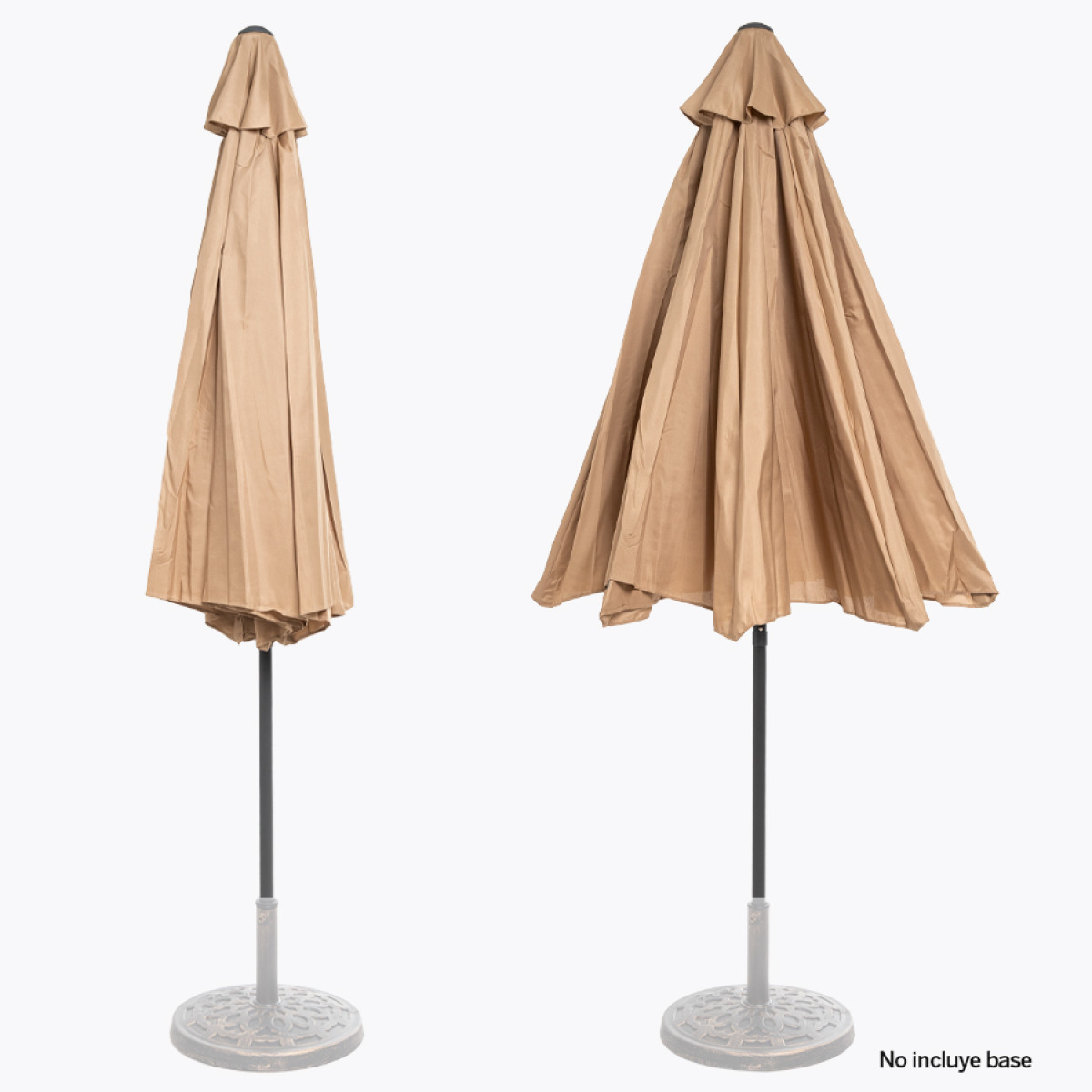 Quitasol redondo de Ø3m, modelo "Shake", con 8 cascos de lona Poliéster UV impermeable de 160g. Contiene varas reforzadas de Acero recubierto de 12 x 18mm, asta de Acero recubierto de 38mm, sistema de apertura automático con manivela y codo giratorio de 45°. No incluye base.