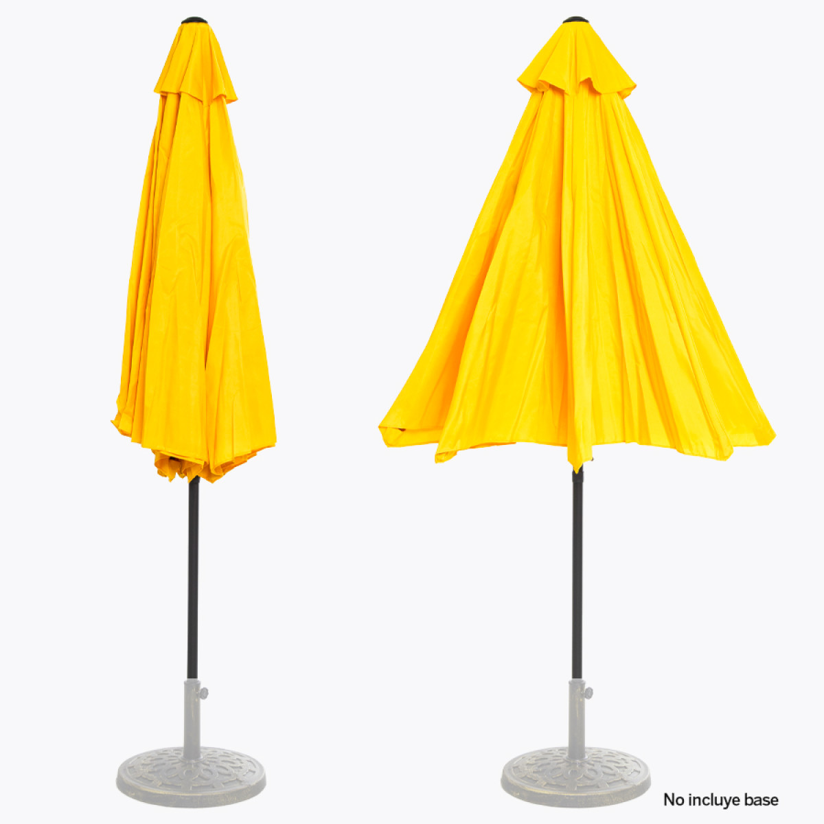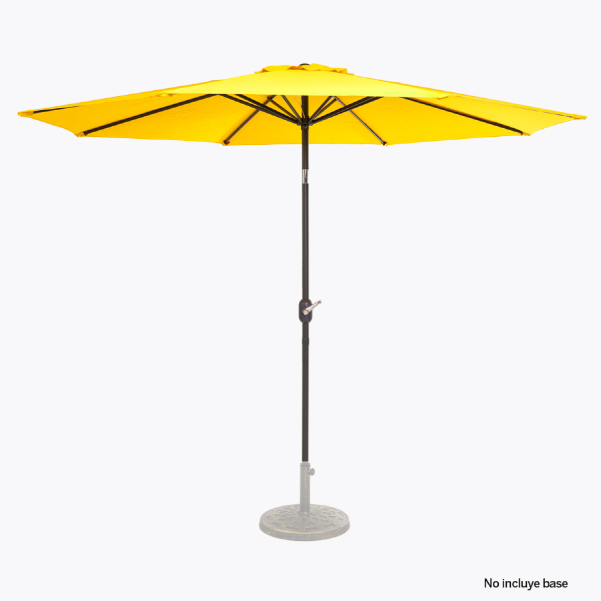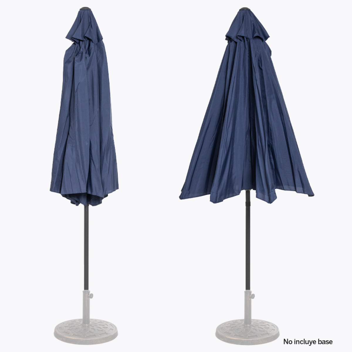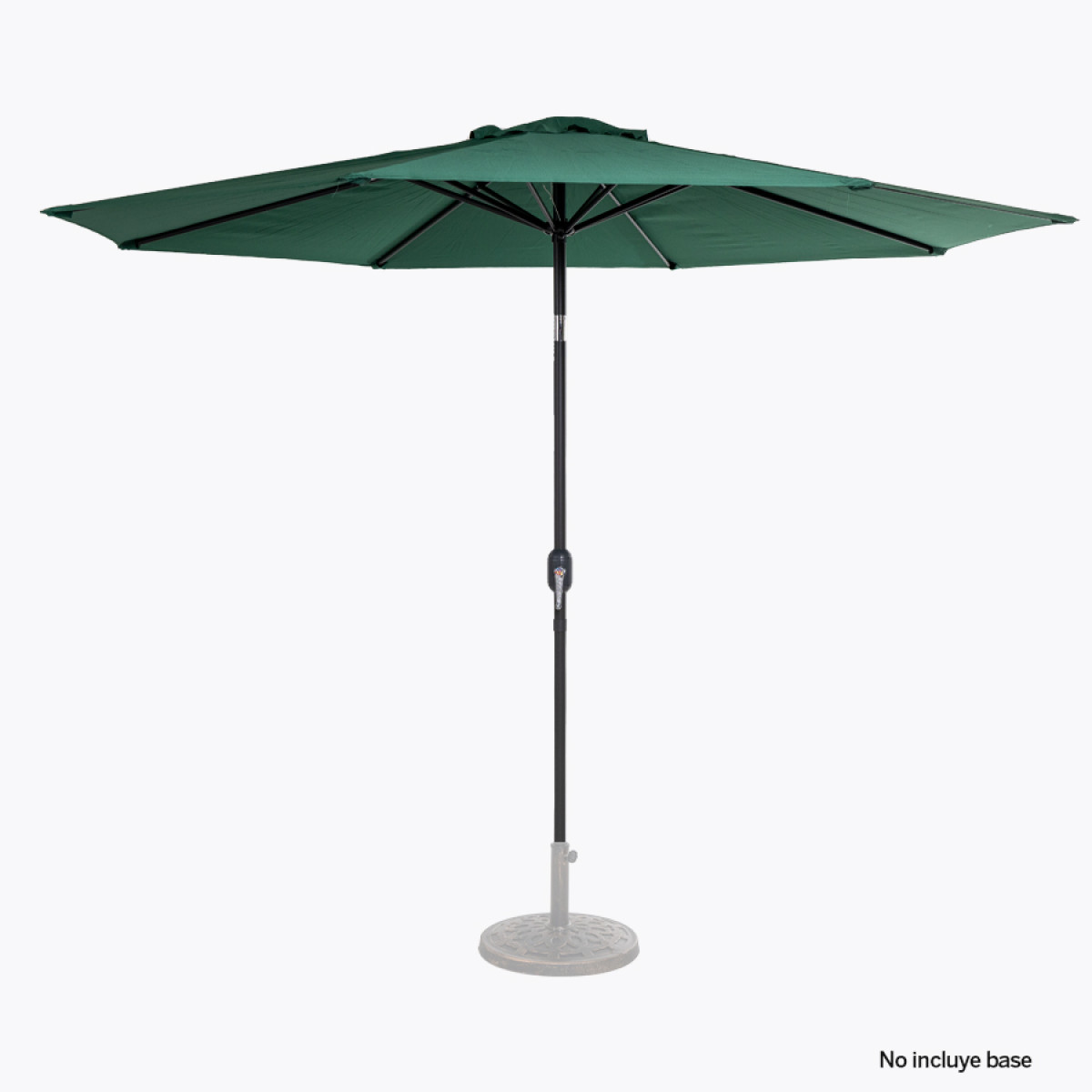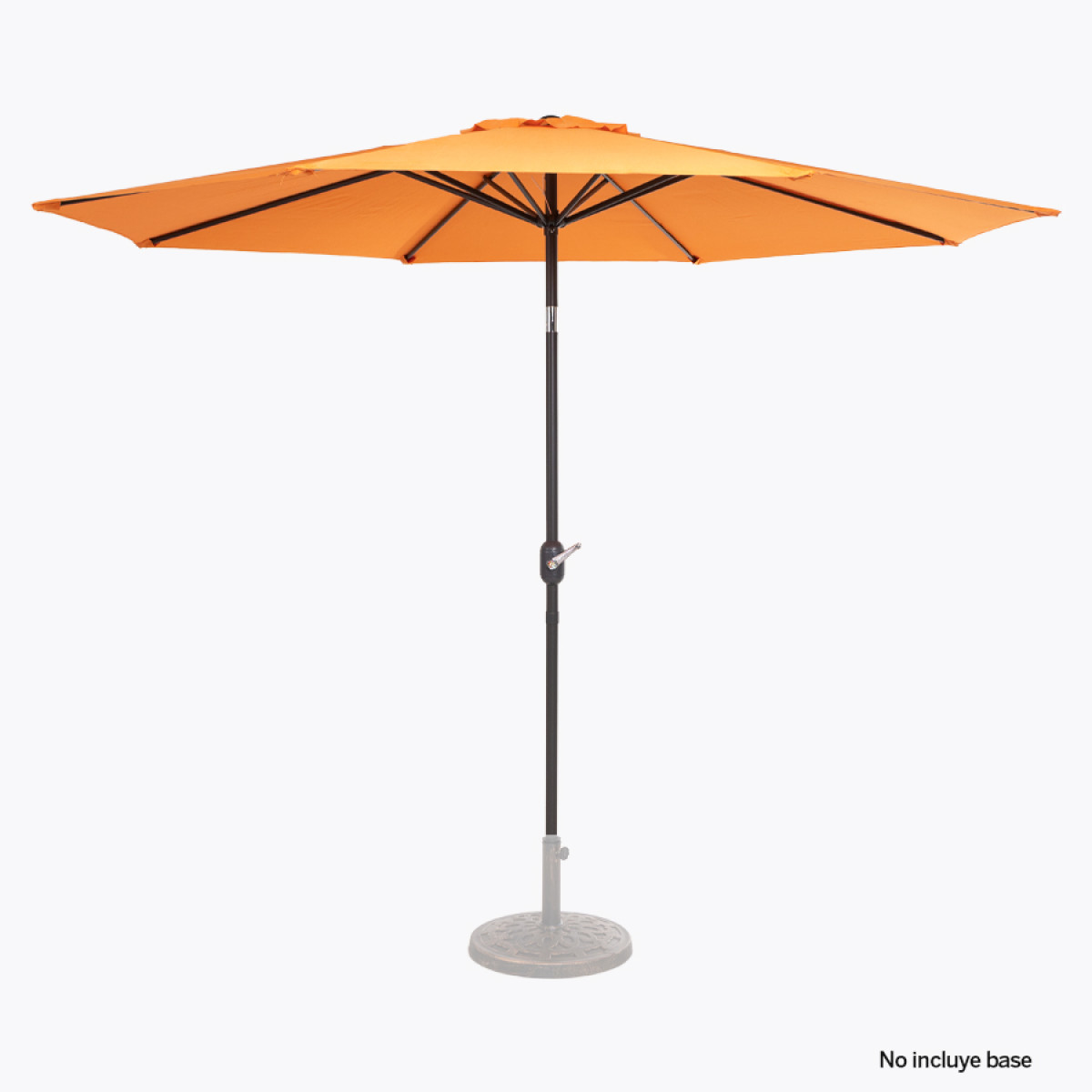 Quitasol redondo de Ø3m, modelo "Shake", con 8 cascos de lona Poliéster UV impermeable de 160g. Contiene varas reforzadas de Acero recubierto de 12 x 18mm, asta de Acero recubierto de 38mm, sistema de apertura automático con manivela y codo giratorio de 45°. No incluye base.