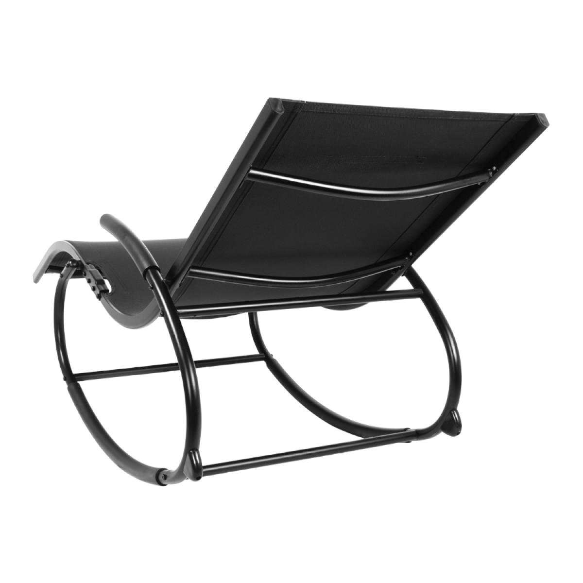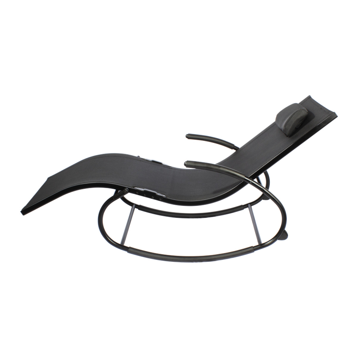 Reposera mecedora negra con apoya-brazos, modelo "Ventus". Estructura de Aluminio color negro, asiento de Textilene negro. Descanso y relajo verdaderos.