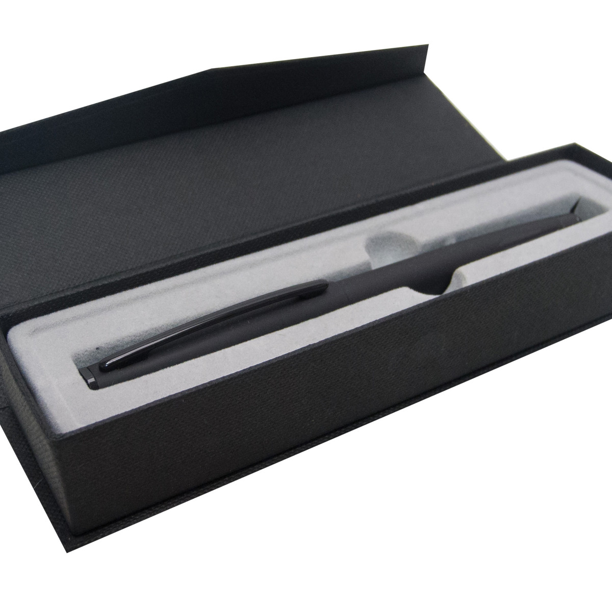 Metal. Roller. Cuerpo de color negro mate, clip con detalles en color negro brillante. Tinta negra. Con estuche de cierre imantado. Destape electroplateado en la parte superior. Presentación en estuche con cierre magnético.