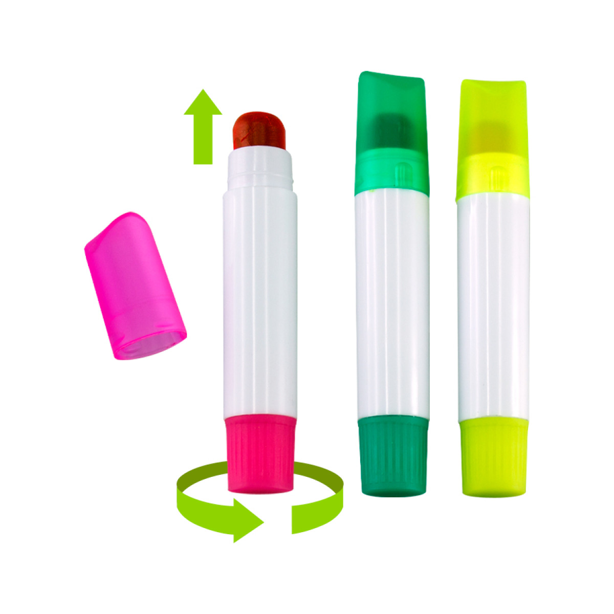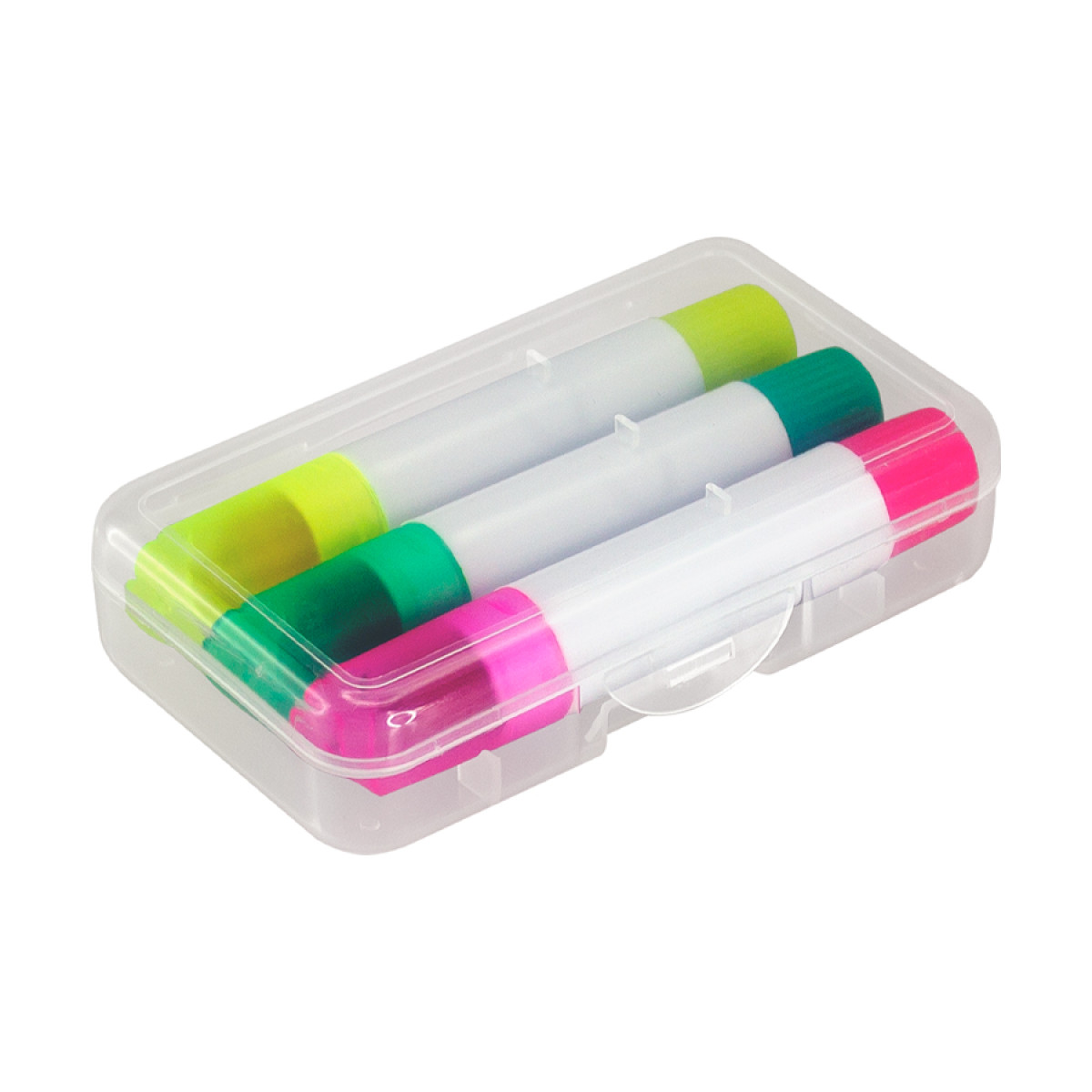 Set de 3 Destacadores de Cera, con dosificador, presentación en Estuche de Plástico transparente. No se secan.