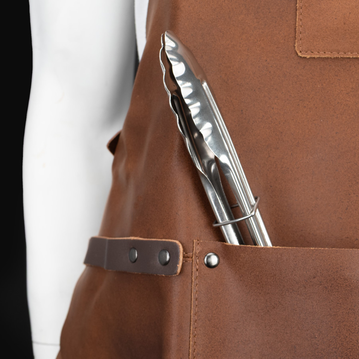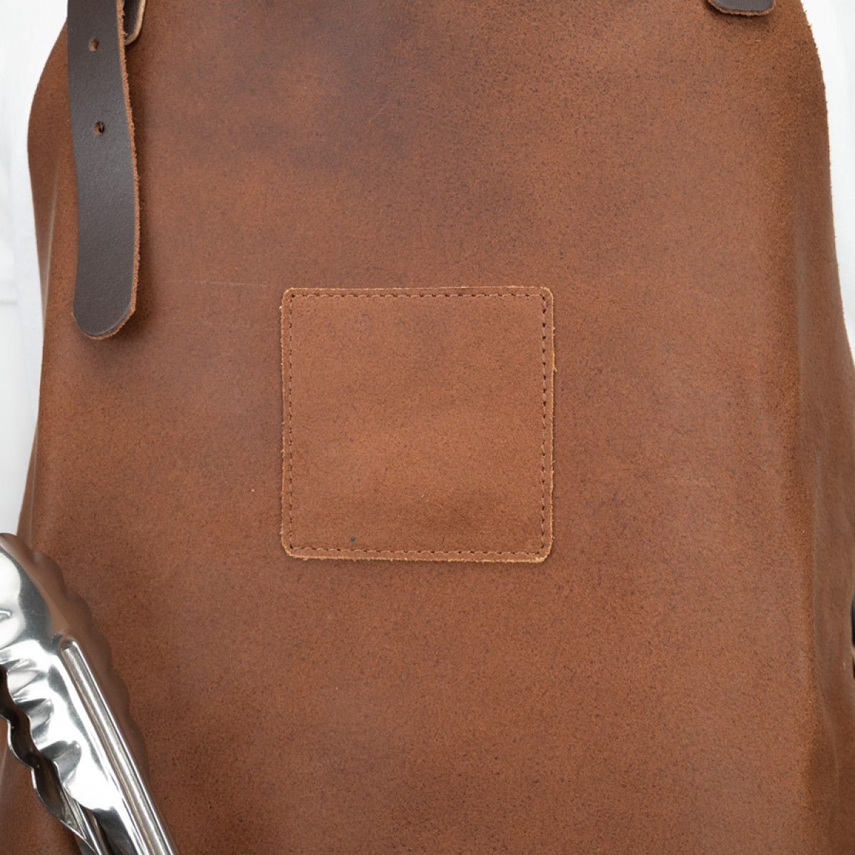 Un regalo fuera de serie. Deluxe set de Asador, contiene Pechera de Asador BBQ en Cuero tostado 100% genuino color café cognac, con cintas y porta-accesorios de Cuero 100% genuino color café oscuro. Remaches de acero envejecido y bolsillo delantero de 20.5 x 23 cm. Cuadrado para logo de 8 x 8 cm. Contiene además largo mitón de Asador BBQ en Cuero engamuzado 100% genuino color café cognac y tenazas de Acero inoxidable. Presentación en elegante caja de regalo de cartón negro con ventana de mica transparente y gráfica a todo color con descripción de los elementos del set.