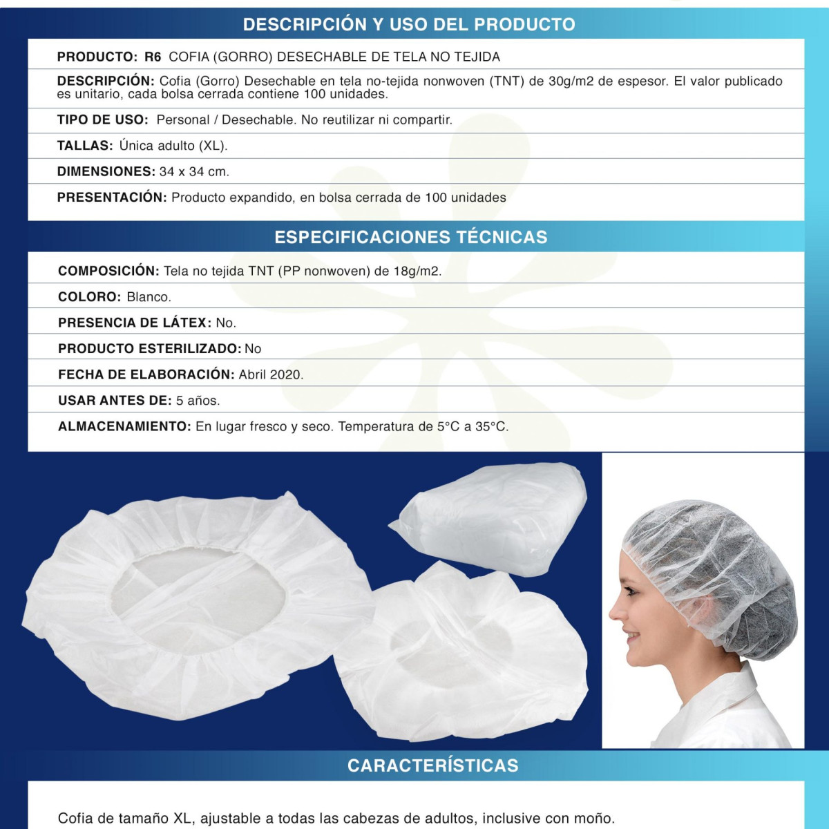 • Presentación: Bolsa con 100 cofias (unidad de venta)