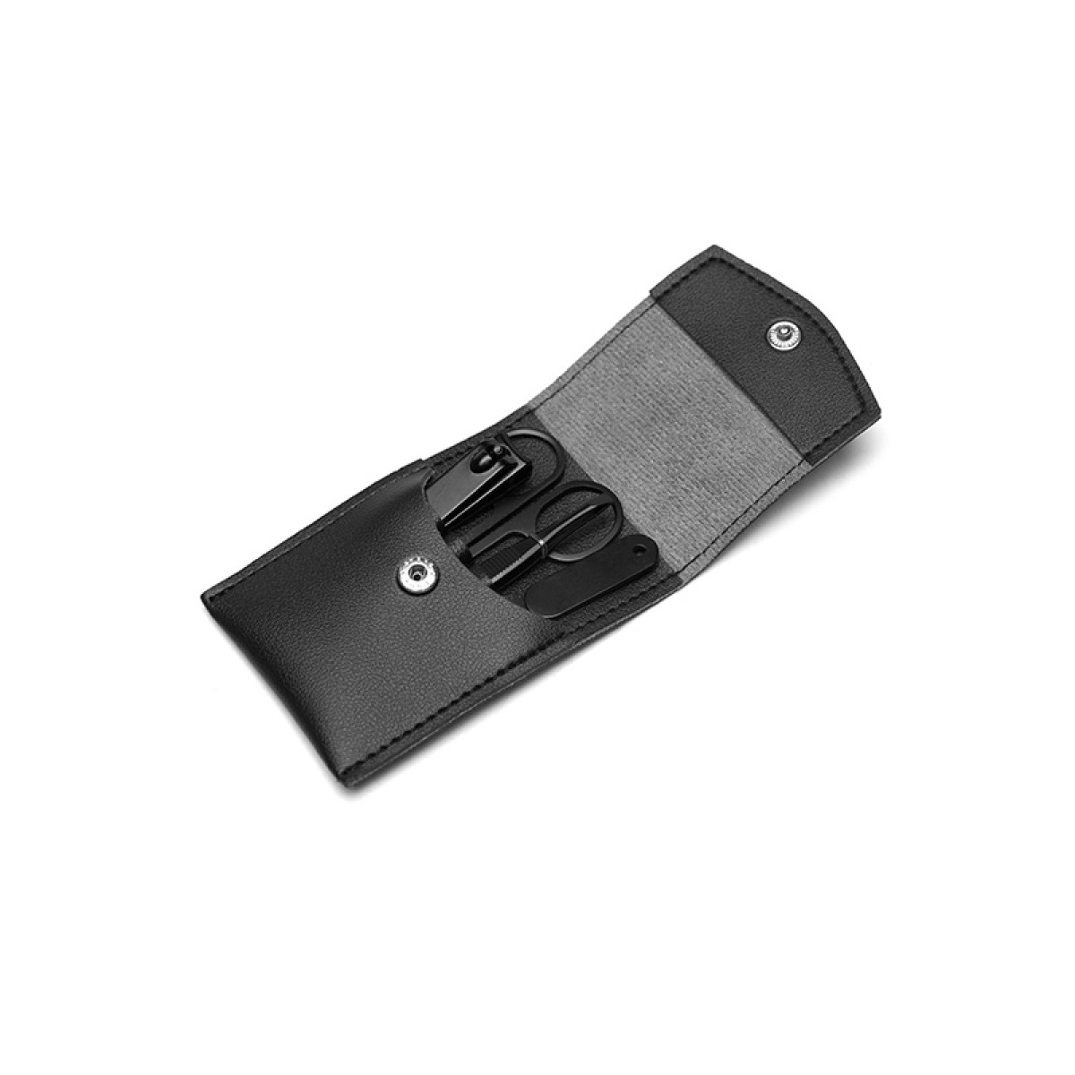 Set de belleza, incluye tijera, cortauñas, pinza de depilar y lima, todos en acero inoxidable color negro. El estuche está confeccionado en cuero PU negro. Medidas:10 x 7 x1.5cm.