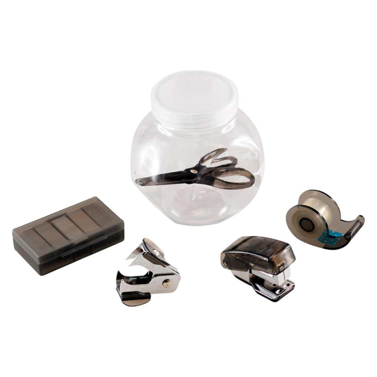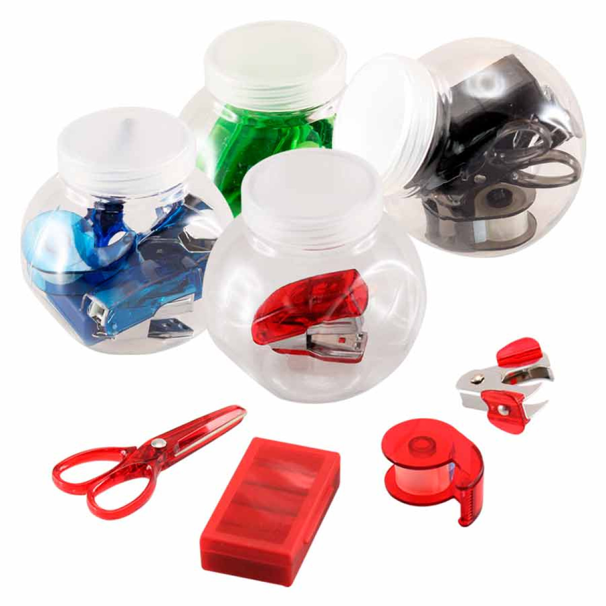 Set de oficina en frasco plástico transparente con tapa frozen. Ideal espacio para logo en tapa.
