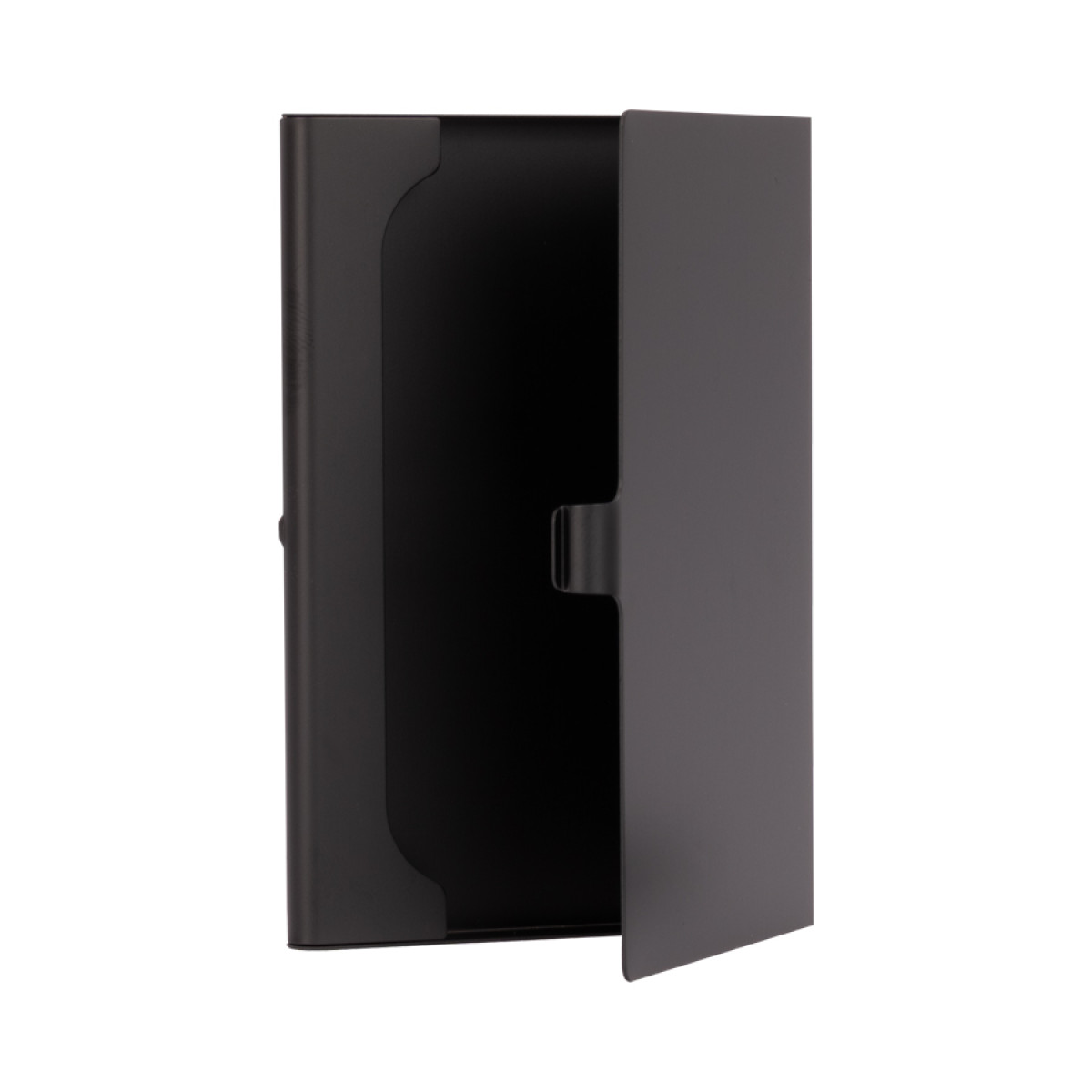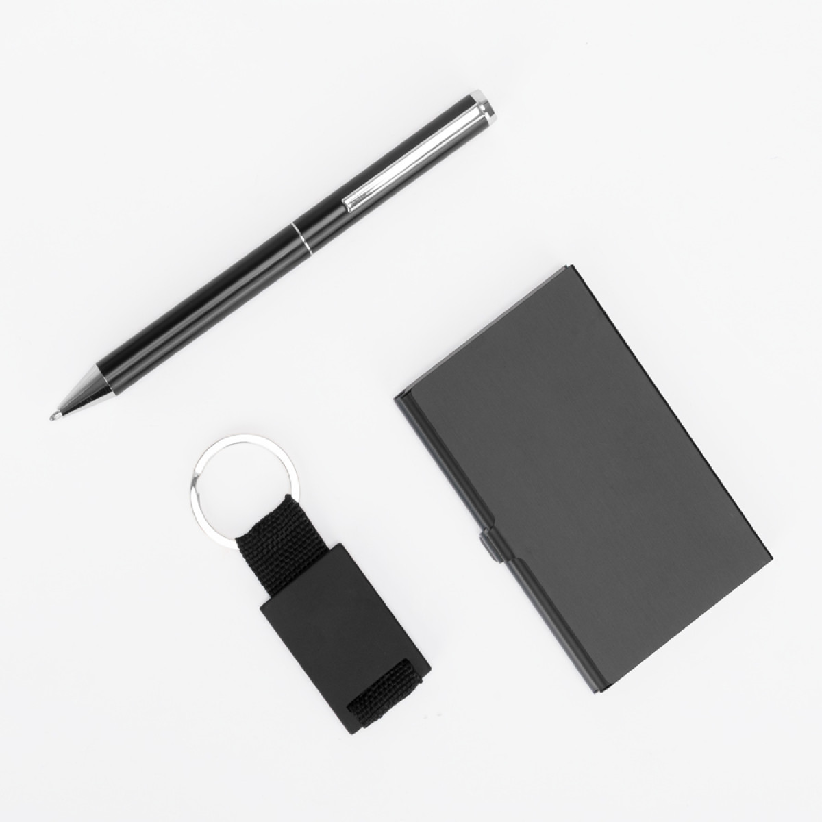 Set de Regalo ejecutivo "ARISTIDE", incluye llavero metálico negro con lanyard de poliéster negro + porta-tarjetas de Aluminio negro + Bolígrafo metálico negro con detalles color plata, escritura negra . Presentación en elegante caja de carton color negro con tapa, interior cuna de EVA aterciopelada negra. Sobre funda de papel negro.