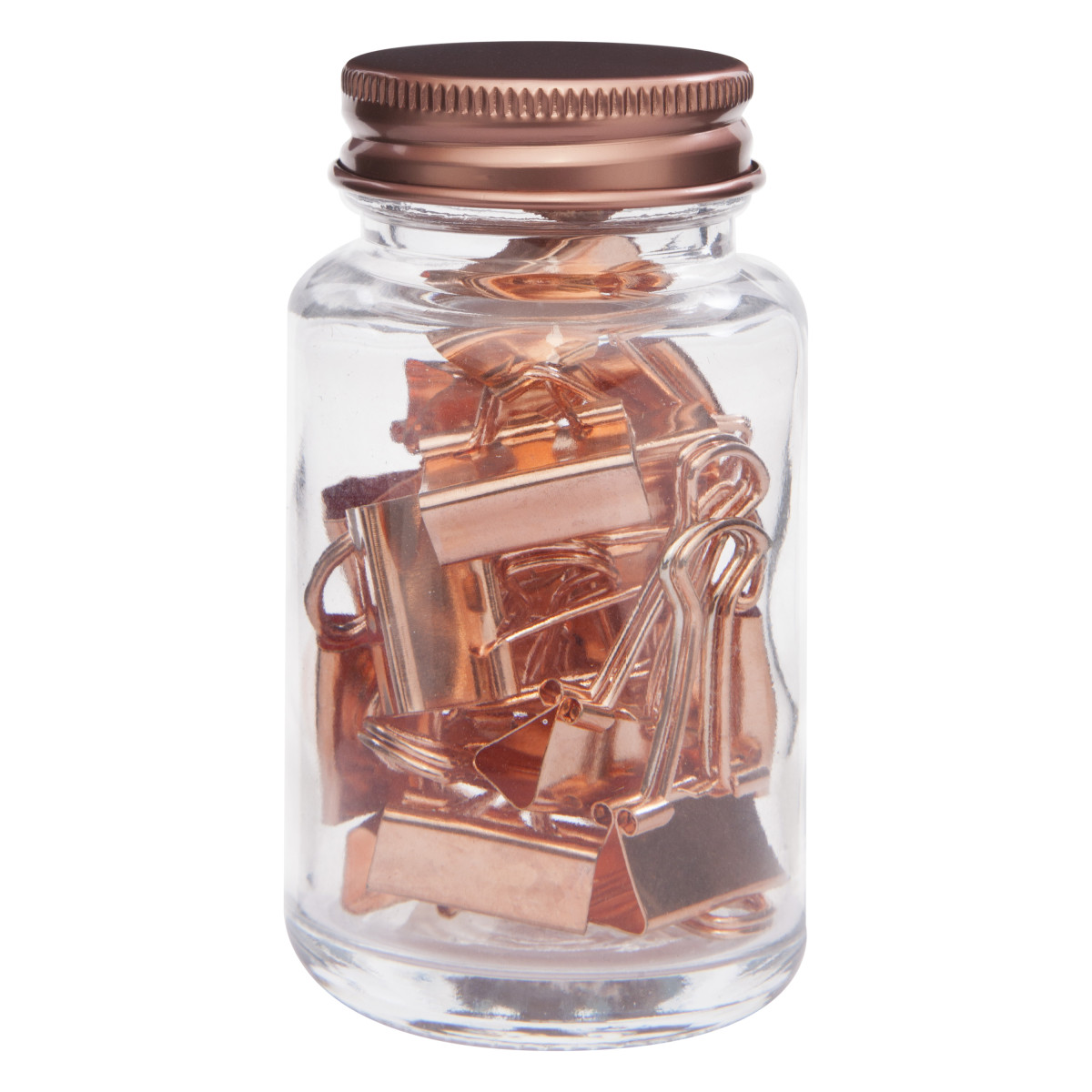 Ø 4,5 x 8,5 cm. Vidrio y metal. Set de sujeta papeles metálicos en frasco de vidrio con tapa metálica.