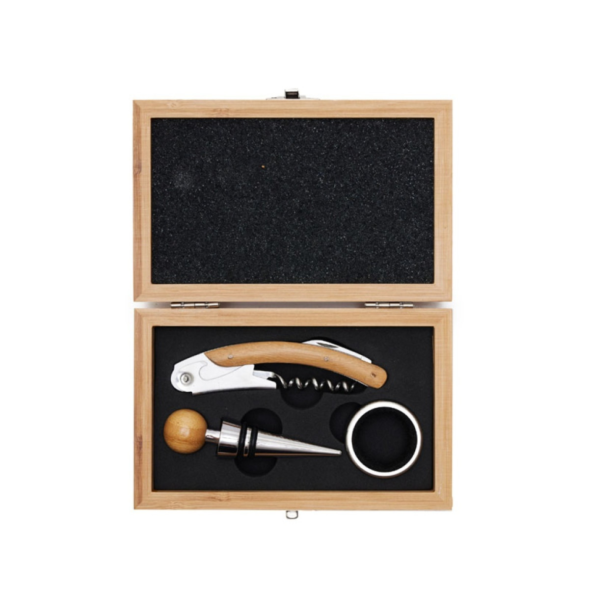 Set de vinos en estuche de bamboo. Contiene sacacorchos dos tiempos con navaja y destapador corona, tapón y collar cortagota. Medidas de la caja: 16 x 10 x 5 cm. La Baule. LOGO24: Producto disponible para el servicio de logueo en 24 horas respetando unidades mínimas de logueo y 200 unidades máximas. Consultar términos y condiciones del servicio