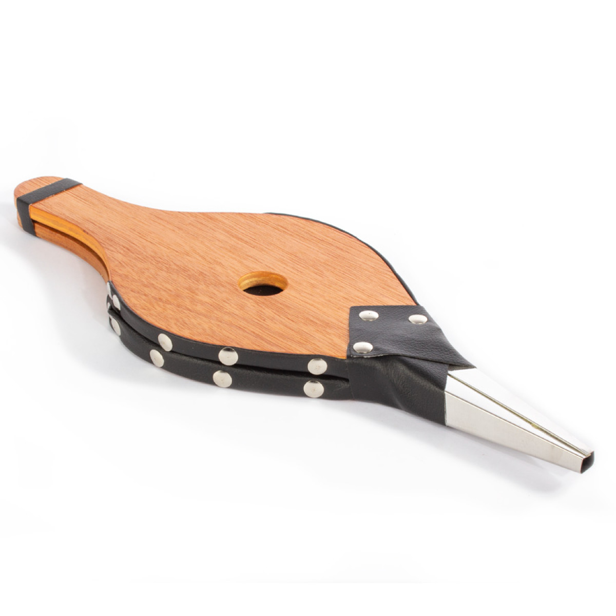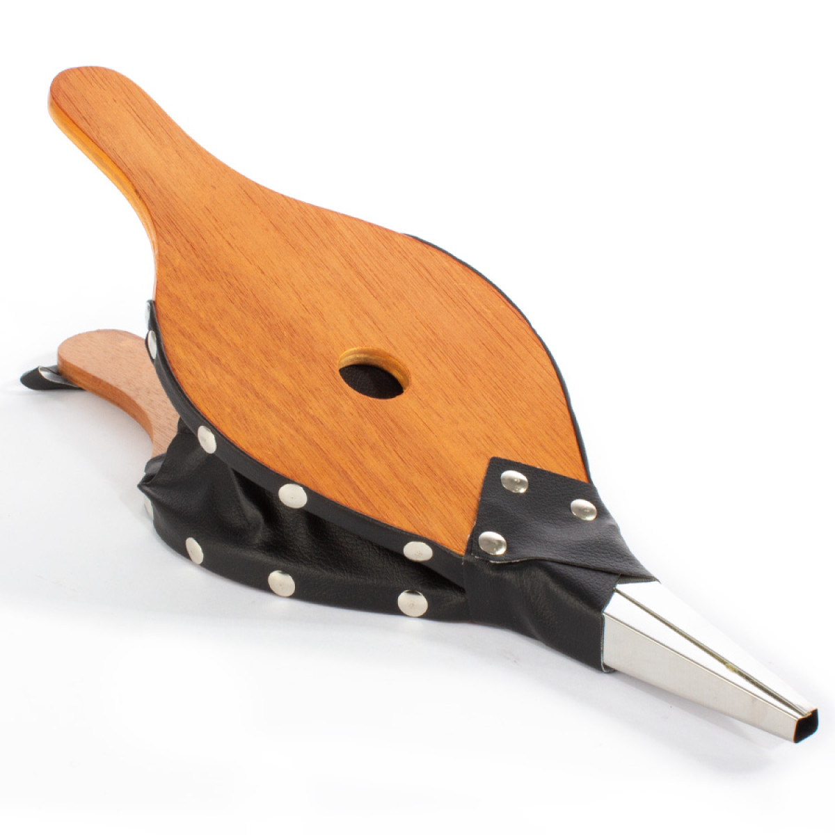 Soplador pequeño de aire tipo Acordeón, para chimemeas y parrillas. Superficie MDF, reforzado con cuero y tachas. Toma de aire posterior. Amplia superficie para logo.