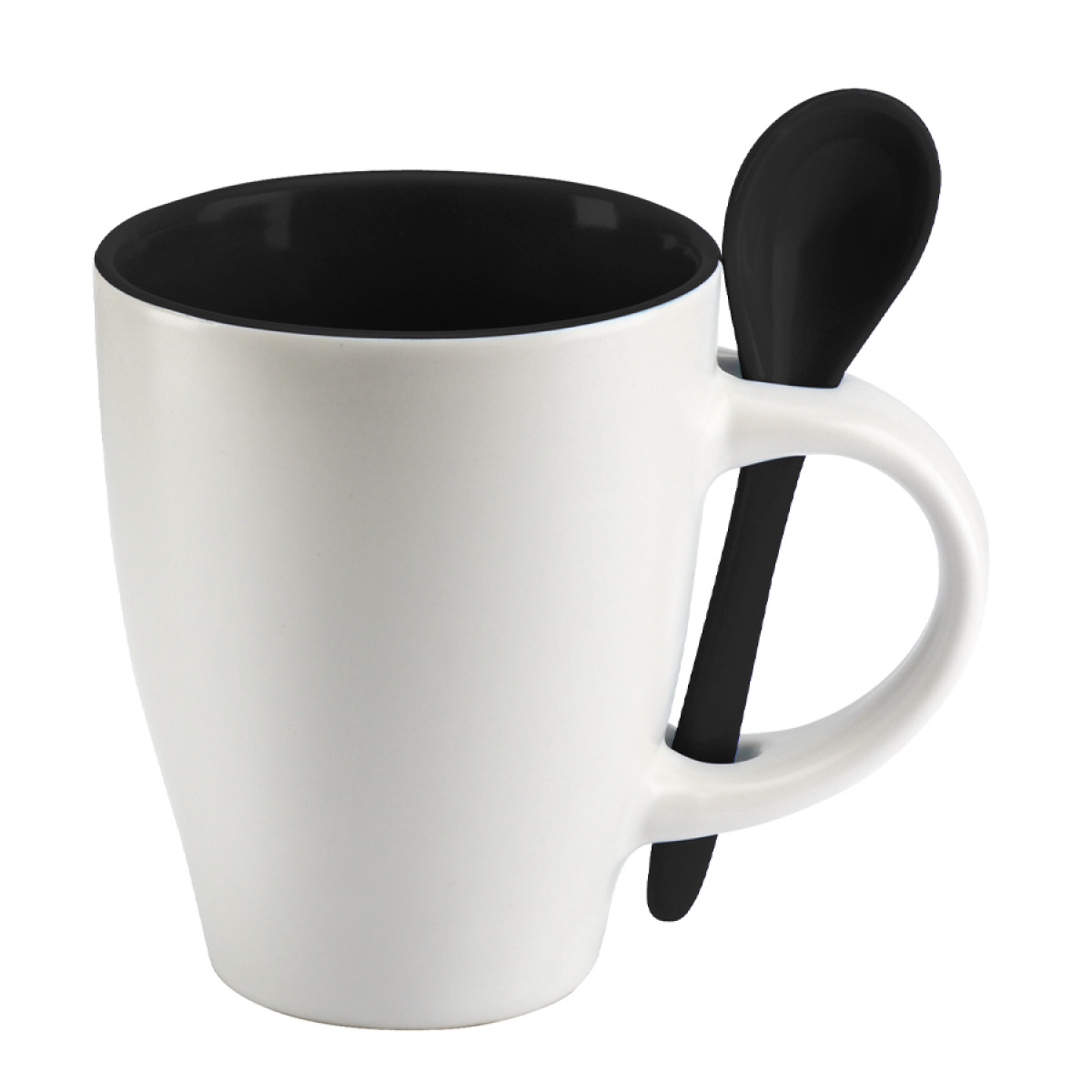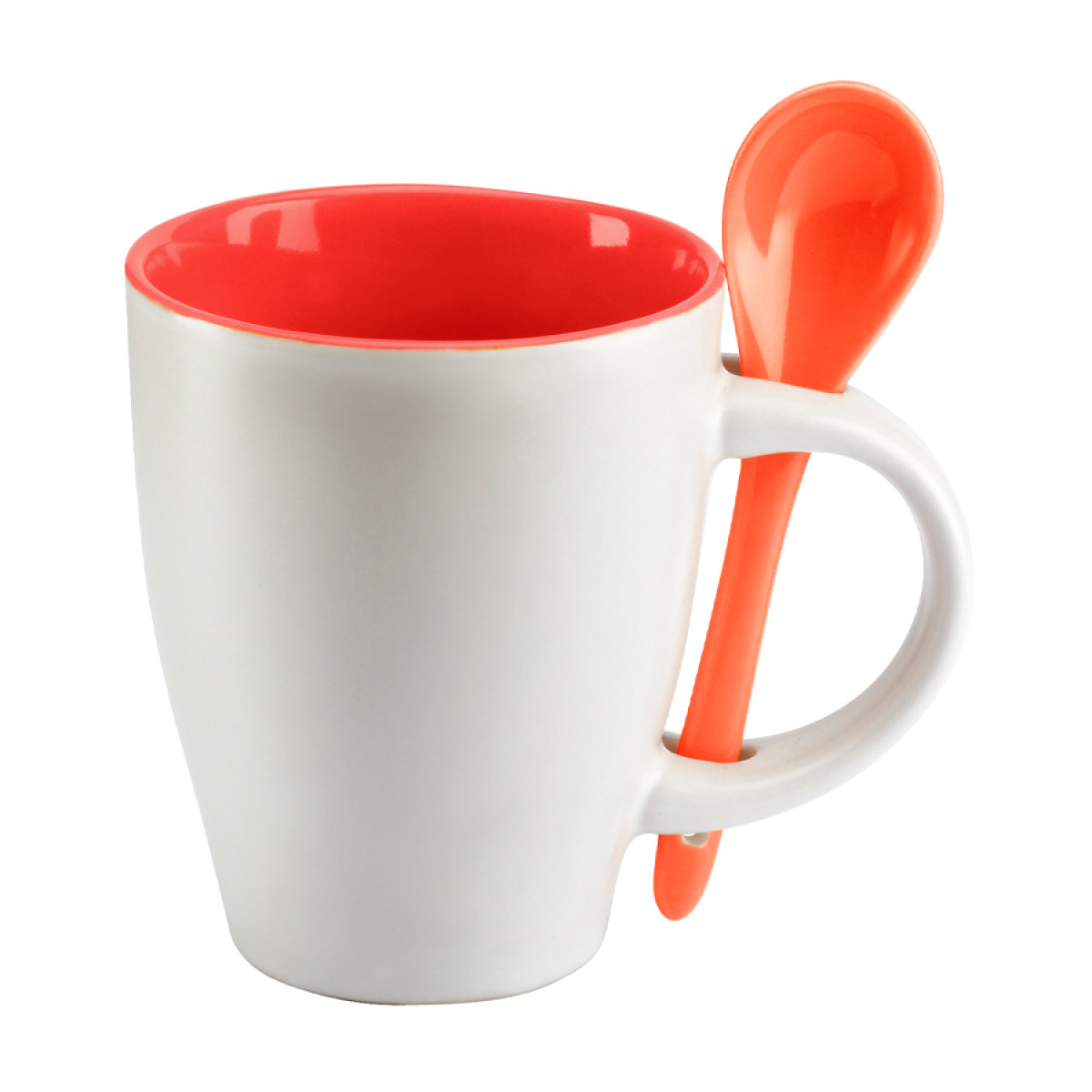 Tazón Cerámico Blanco opaco con interior y cuchara de color. Presentación en caja de cartón blanco.