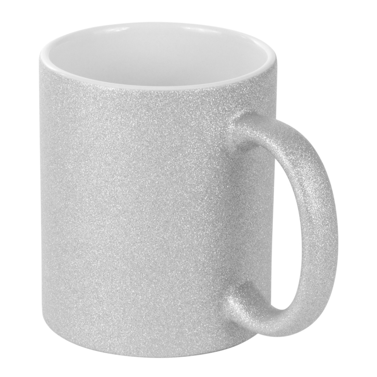 Tazón cerámico de 350cc. con superficie exterior glitter plateado, para Sublimación. Incluye caja blanca de Cartón color plata.