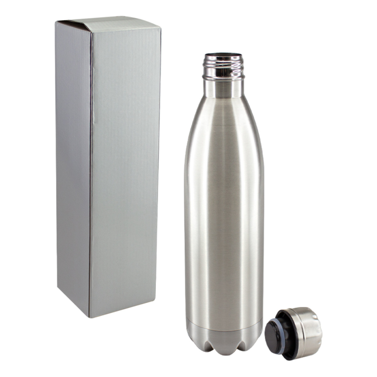 Termo modelo "Botella" de 750cc, en Acero inoxidable, tapa rosca. Presentación en estuche de cartón laminado plateado.