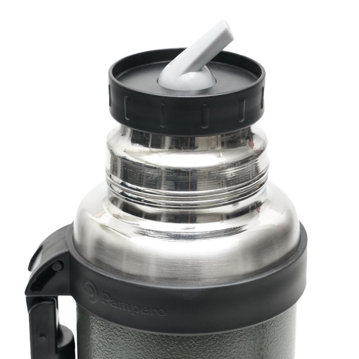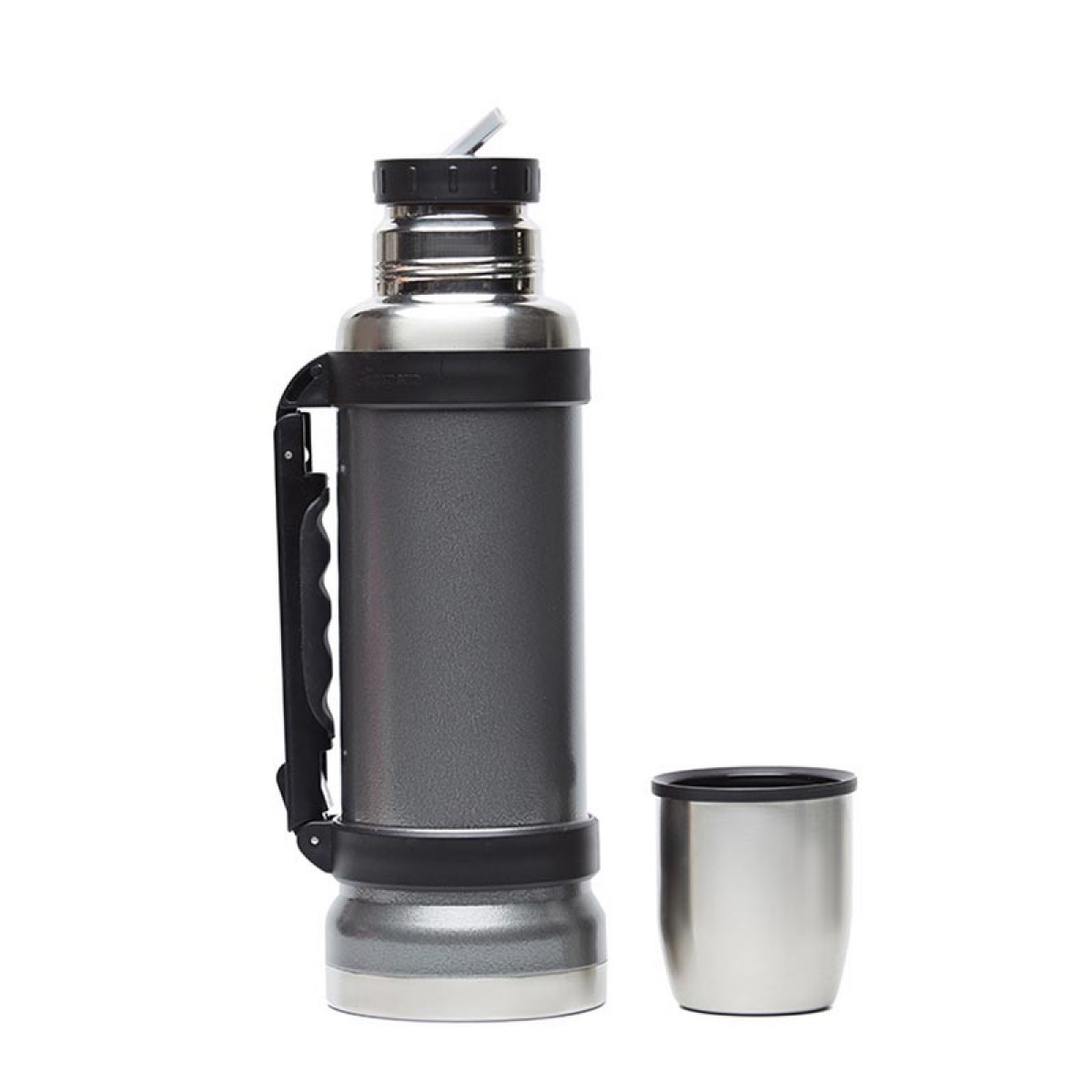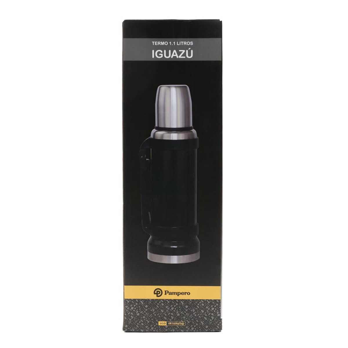 Termo de acero inoxidable 304, recubierto con esmalte especial que protege de ralladuras y golpes. Puede mantener el contenido a la misma temperatura durante 18hs, gracias a su doble pared aislante especial de acero. Cuenta con un tapón cebador Hermético a rosca con la función anti derrame y tapa con superficie plana estable para usar como taza o vaso y manija plegable para facilitar el transporte. Presentado en caja de cartón. Medidas del termo: 34 cm x 10,5 cm. Medidas de la caja: 35 x 11 x 11 cm. Capacidad: 1,1 Lts.