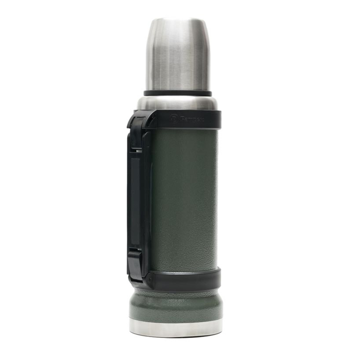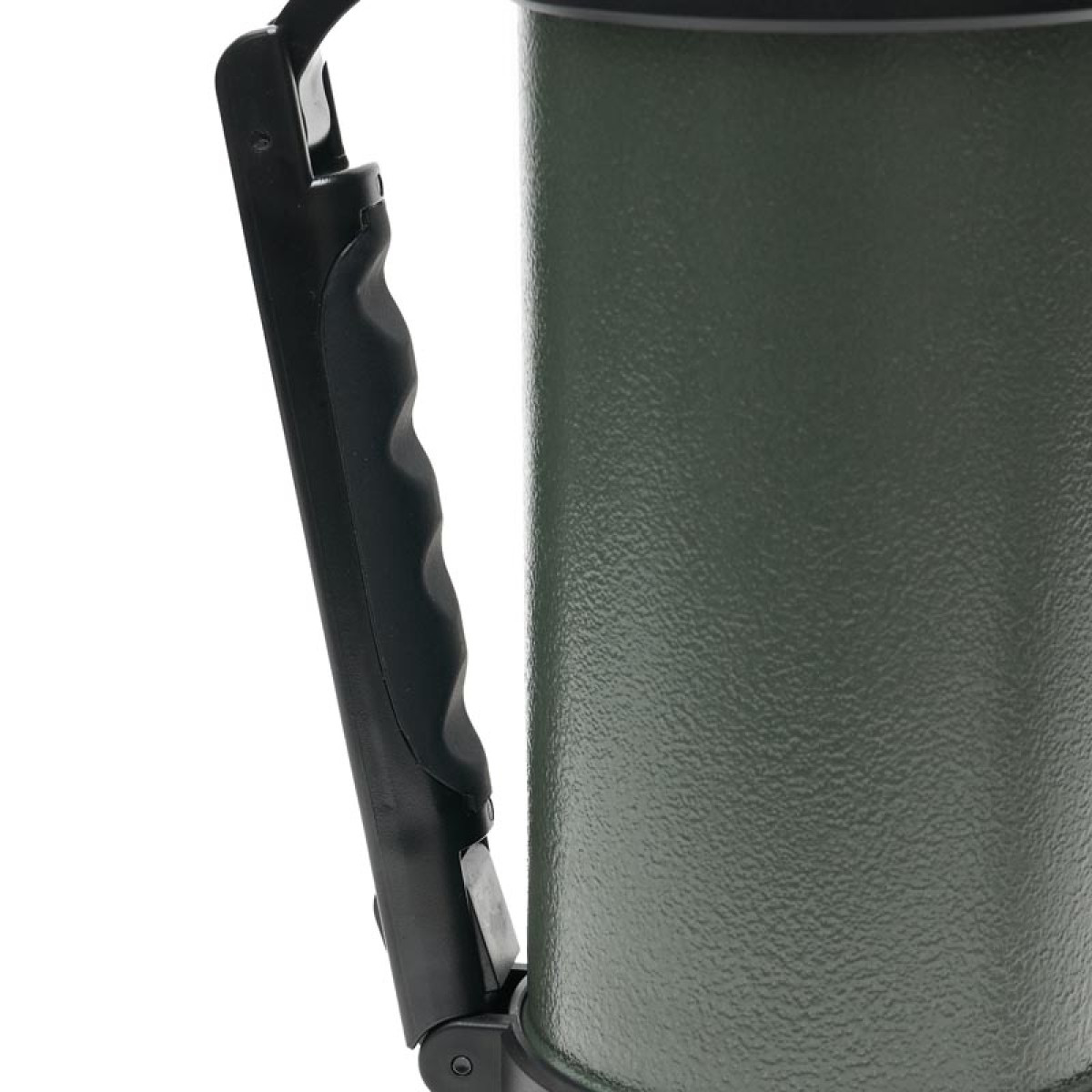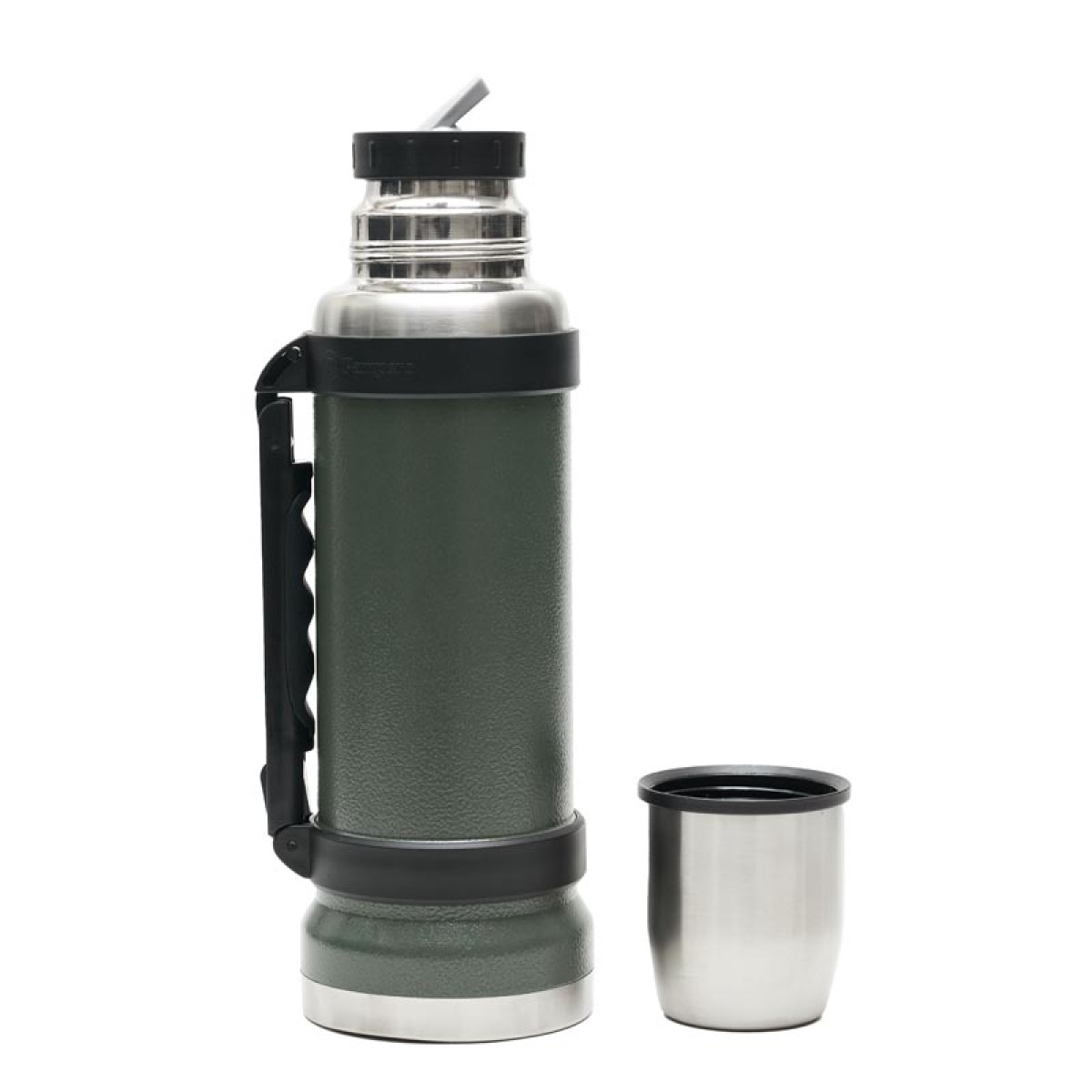 Termo de acero inoxidable 304, recubierto con esmalte especial que protege de ralladuras y golpes. Puede mantener el contenido a la misma temperatura durante 18hs, gracias a su doble pared aislante especial de acero. Cuenta con un tapón cebador Hermético a rosca con la función anti derrame y tapa con superficie plana estable para usar como taza o vaso y manija plegable para facilitar el transporte. Presentado en caja de cartón. Medidas del termo: 34 cm x 10,5 cm. Medidas de la caja: 35 x 11 x 11 cm. Capacidad: 1,1 Lts.