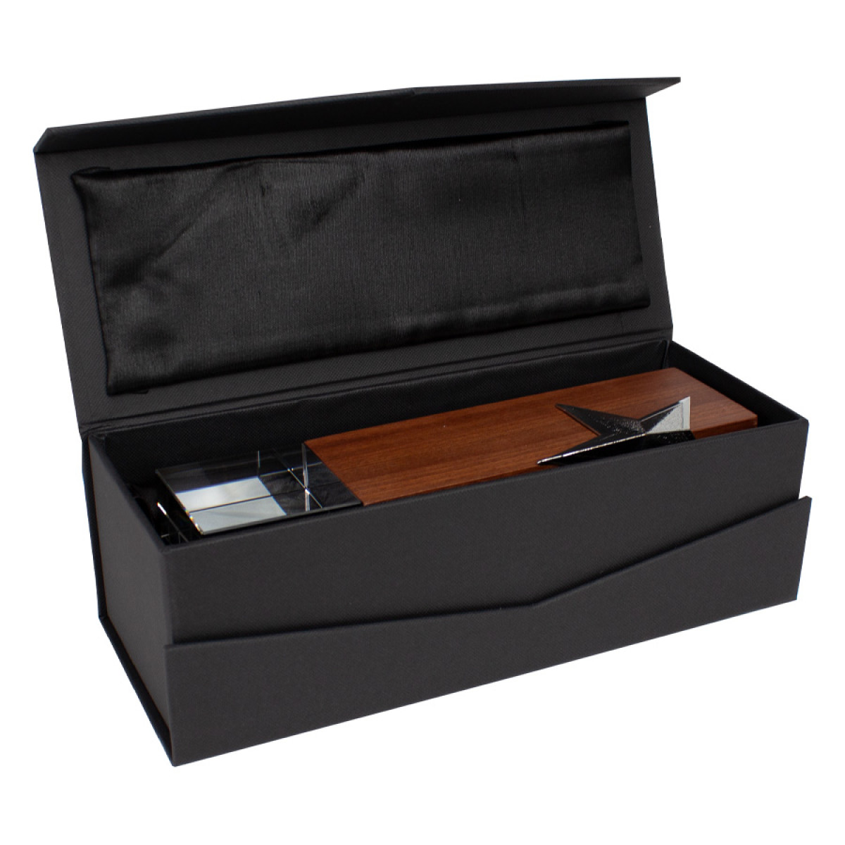 Elegante Trofeo de Madera y Cristal modelo "Silver Star"". Incluye estrella de acero inoxidable en una de las aristas de madera. Presentación en caja de cartón forrado negro con cierre imantado, interior acolchado de espuma y tela poliéster satinado negro, con troquel.