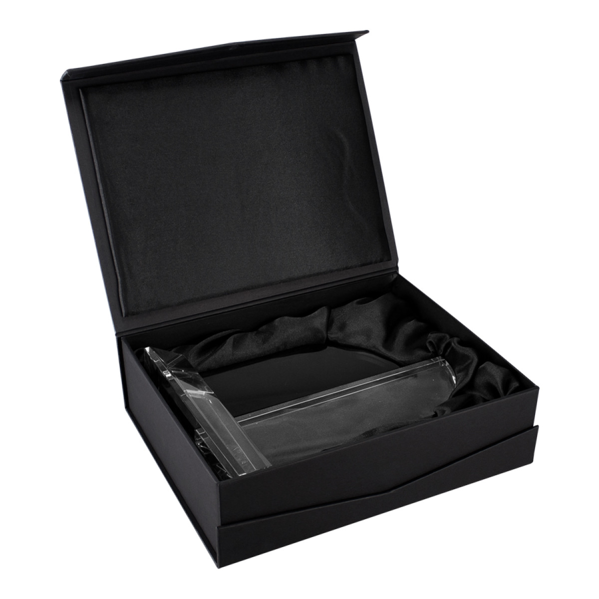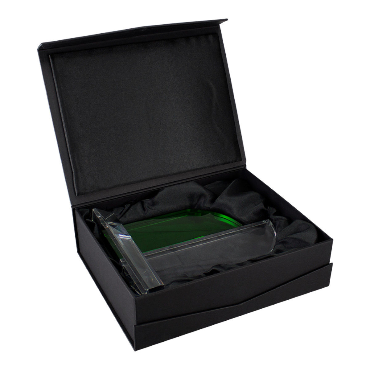 Deluxe Trofeo grande de Cristal modelo "Catedral" con aplicación de cristal-color. Presentación en caja de cartón forrado negro.