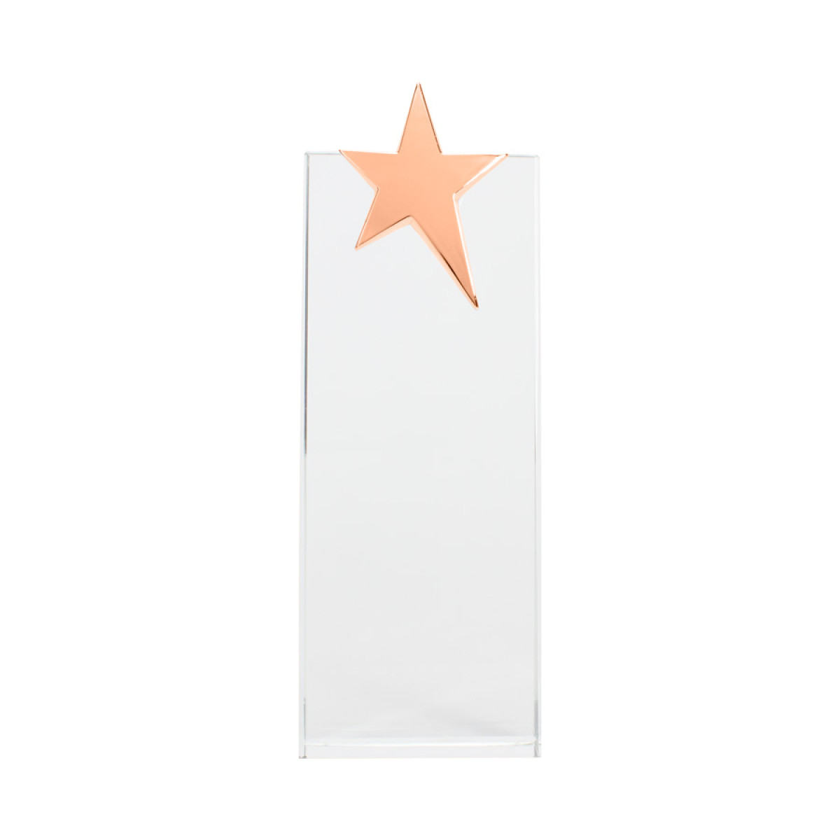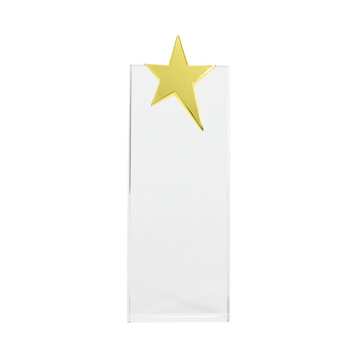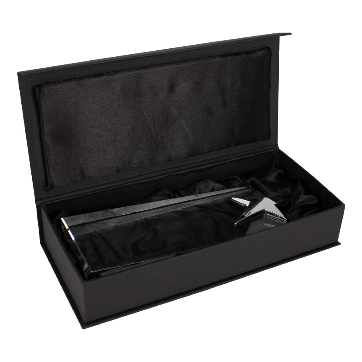 Elegante Trofeo Galvano de Cristal modelo "Ledecky", con estrella de acero inoxidable de color metalizado en su parte superior. Presentación en caja de cartón forrado negro con cierre imantado, interior acolchado de espuma y tela poliéster satinado negro, con troquel.