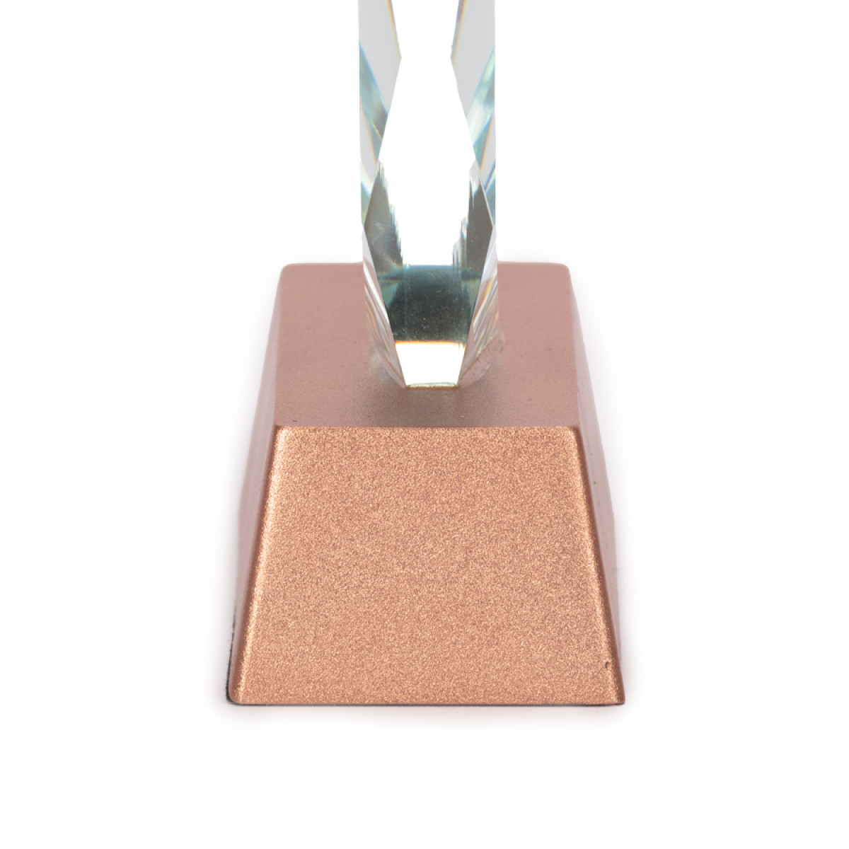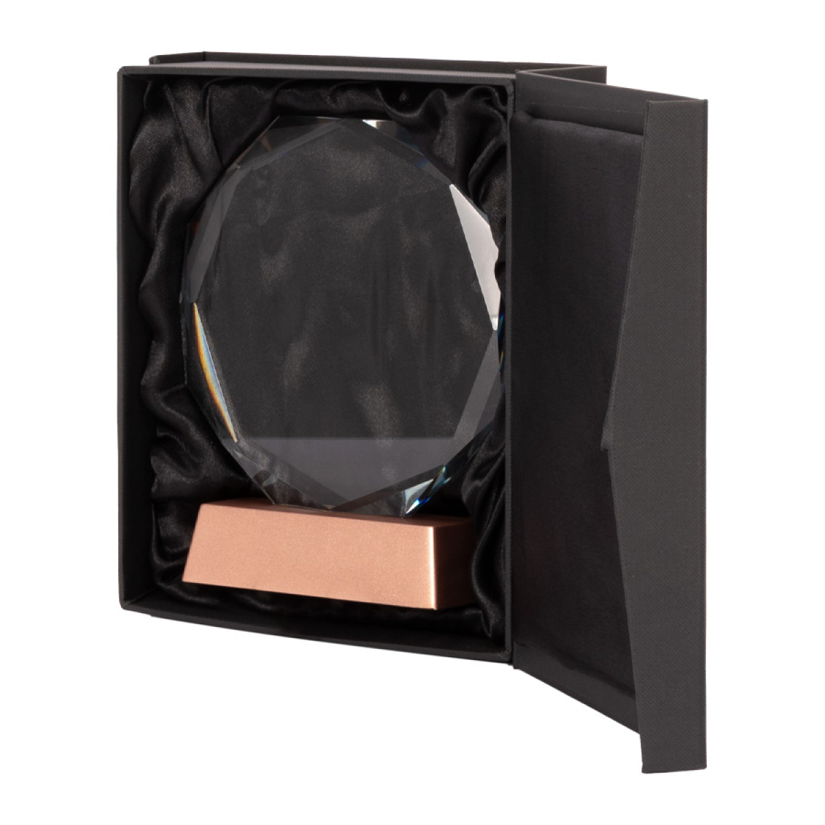 Trofeo Galvano redondo de Cristal modelo "RUNE", con base de acero encobrizado. Presentación en caja de cartón forrado negro con cierre imantado, interior acolchado de espuma y tela poliéster satinado negro, con troquel.