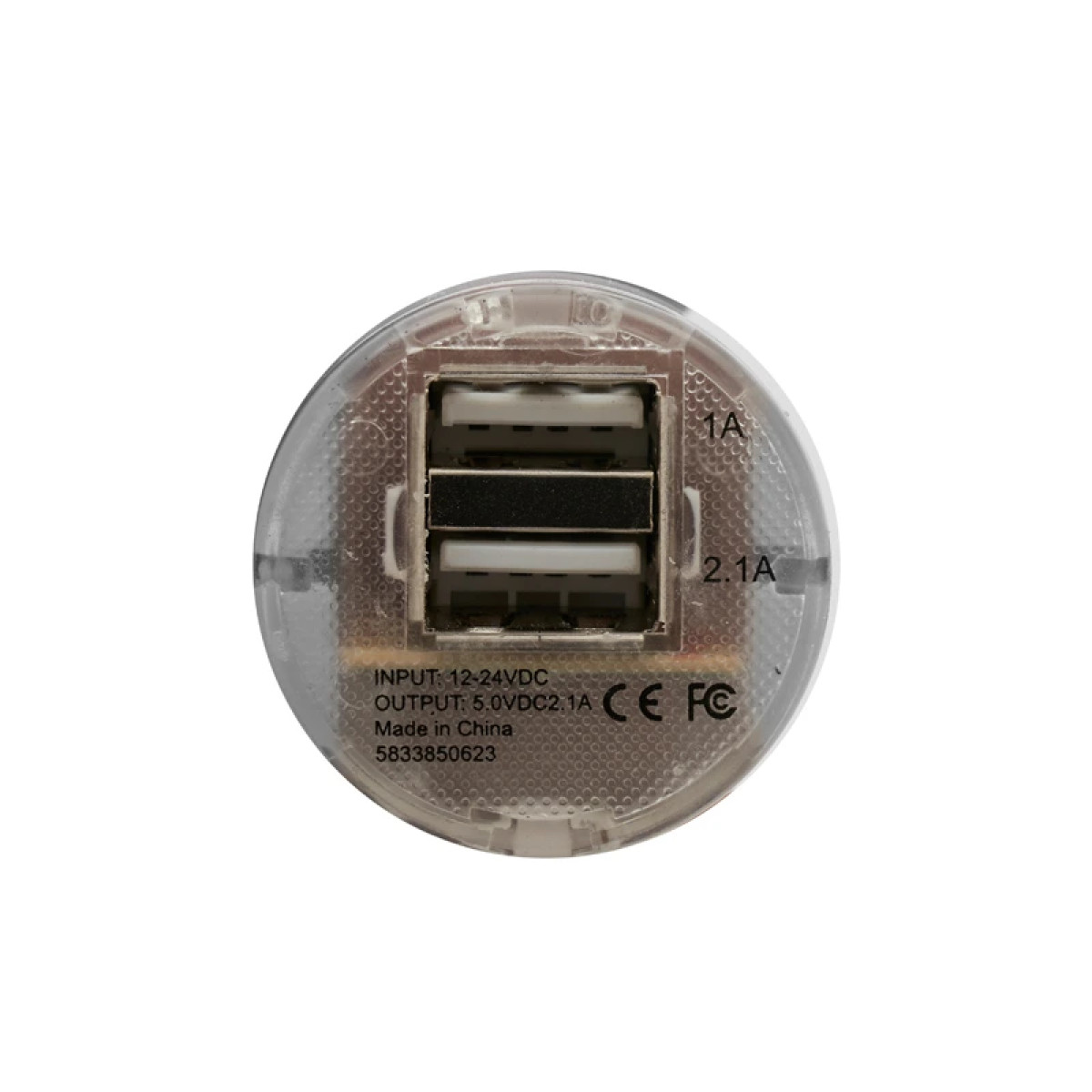 Cargador USB para automóvil en color blanco fabricado en ABS. Entrada de 12-24V y salida de 5V/1,5A. El producto viene en una caja de cartón. Dimensiones: 7,6 x 3,7 x 2,8 cm.