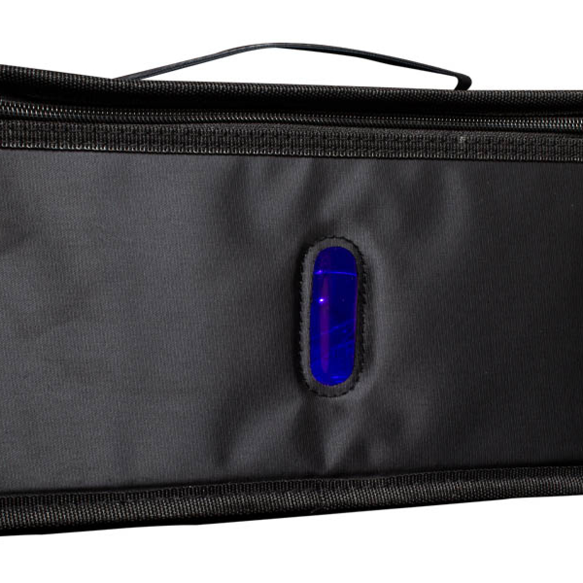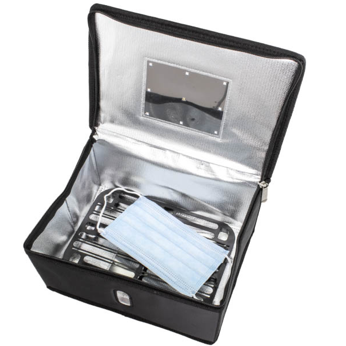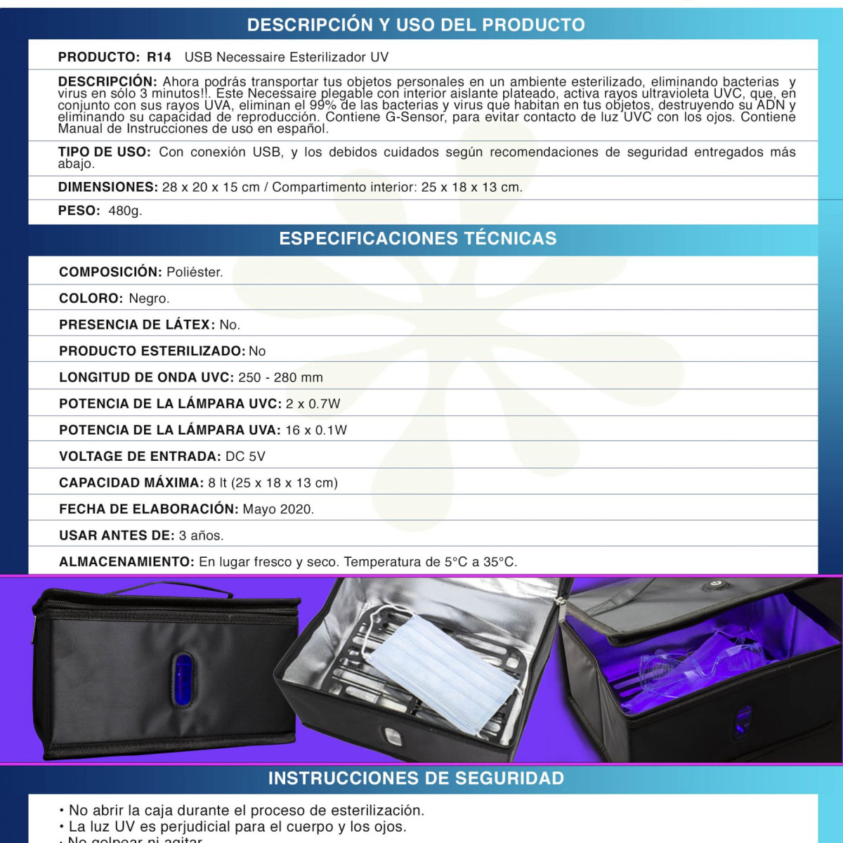 Ahora podrás transportar tus objetos personales en un ambiente esterilizado, eliminando bacterias y virus en sólo 3 minutos!! Este Necessaire plegable con interior aislante plateado, activa rayos ultravioleta UVC, que, en conjunto con sus rayos UVA, eliminan el 99% de las bacterias y virus que habitan en tus objetos, destruyendo su ADN y eliminando su capacidad de reproducción. Contiene G-Sensor, para evitar contacto de luz UVC con los ojos. Contiene Manual de Instrucciones de uso en español.+