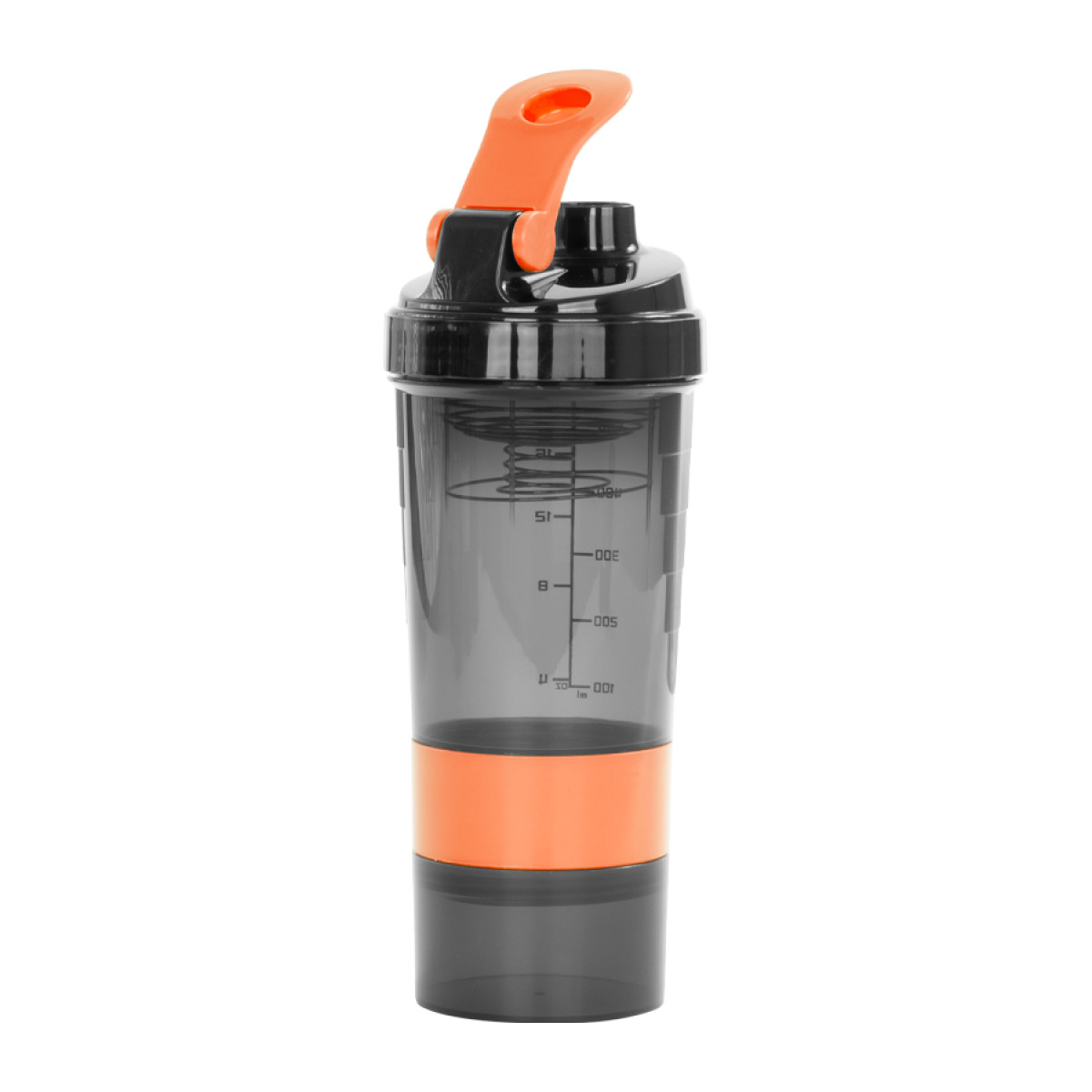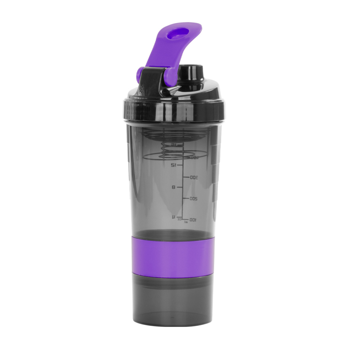 Este es el vaso shaker más completo del mercado, que no puede faltar en tu visita al gym o tus salidas al aire libre, deportes o entrenamientos. Vaso plástico Gym para batidos proteína "SHAKE". Contiene 4 compartimentos, el superior para líquidos, y los 2 de abajo para polvos, proteínas, etc. Además, contiene un cuarto compartimento con 3 divisiones, ideal para guardar píldoras u optros accesorios pequeños. Boquilla superior con tapa. En su parte superior interior, contiene espiral de acero inoxidable, para evitar el pegado del polvo a las paredes del vaso.